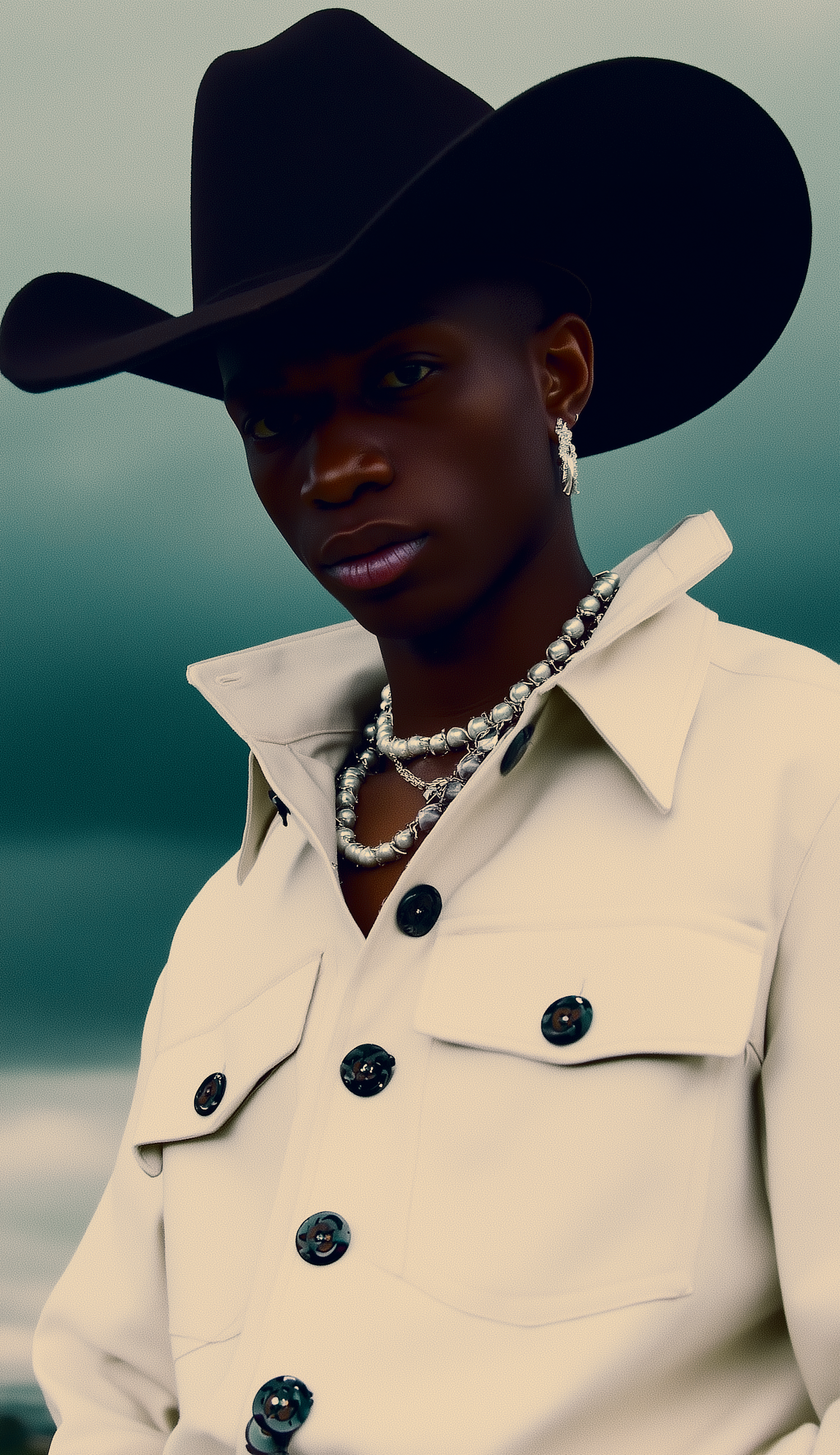Stylish individual in a light shirt and black hat, accessorized with silver jewelry, set against a softly blurred gradient background.