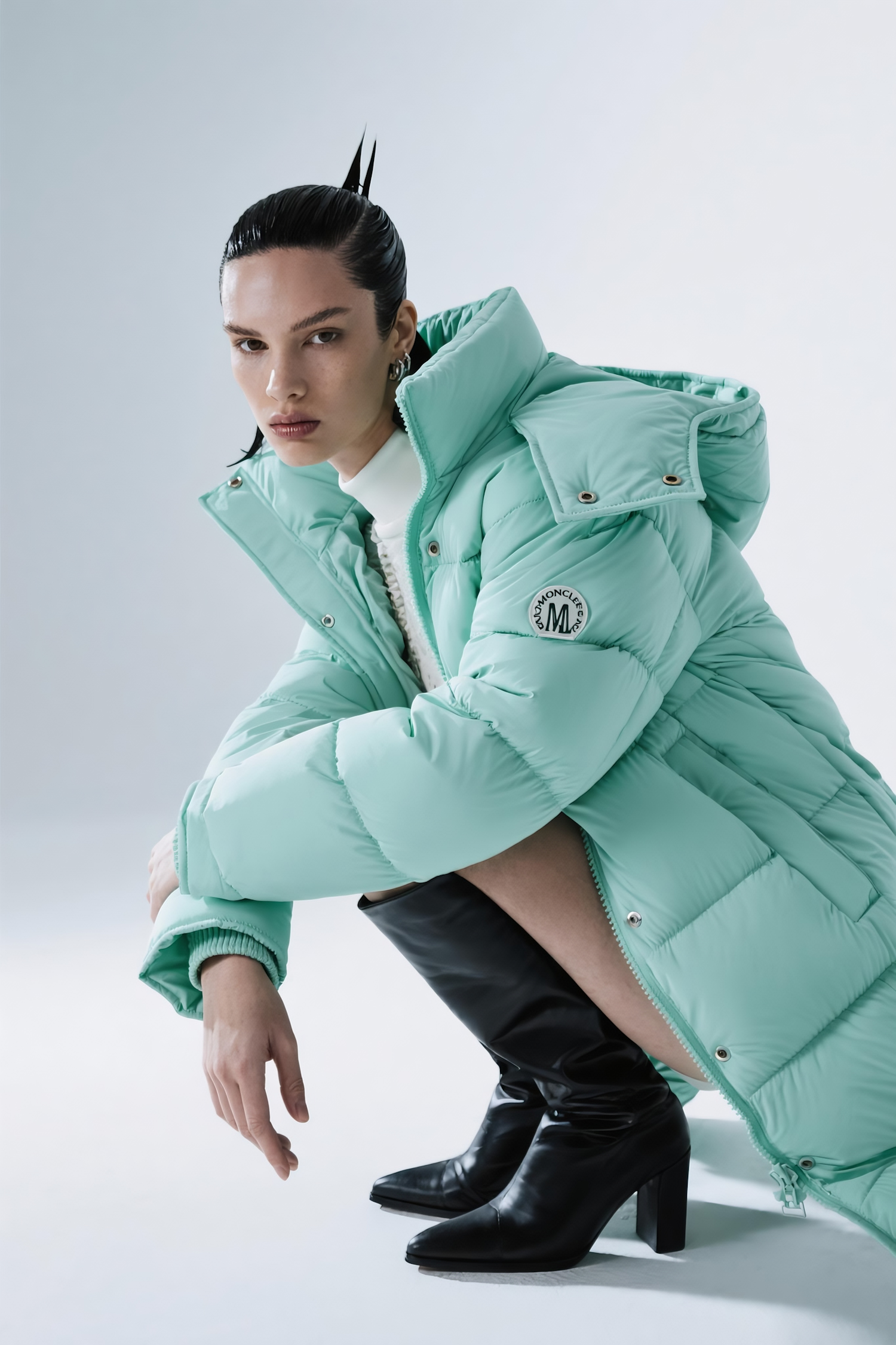 Stylish individual in a mint green puffer jacket and black knee-high boots, striking a bold pose against a minimal background.