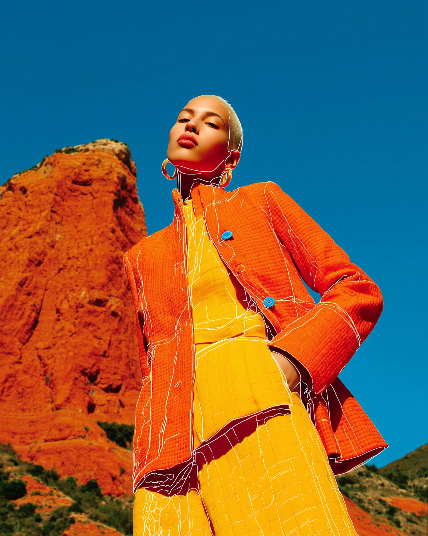 Stylish individual in vibrant orange and yellow attire with artistic overlays, posing against a striking red rock and blue sky backdrop.