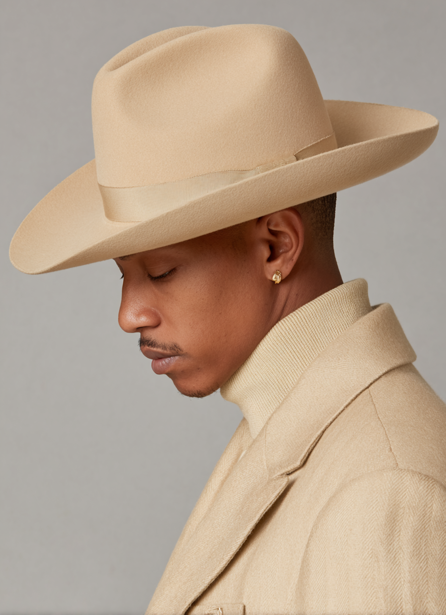 A stylish man in a beige hat and coat, showcasing a sophisticated and elegant look against a neutral background.