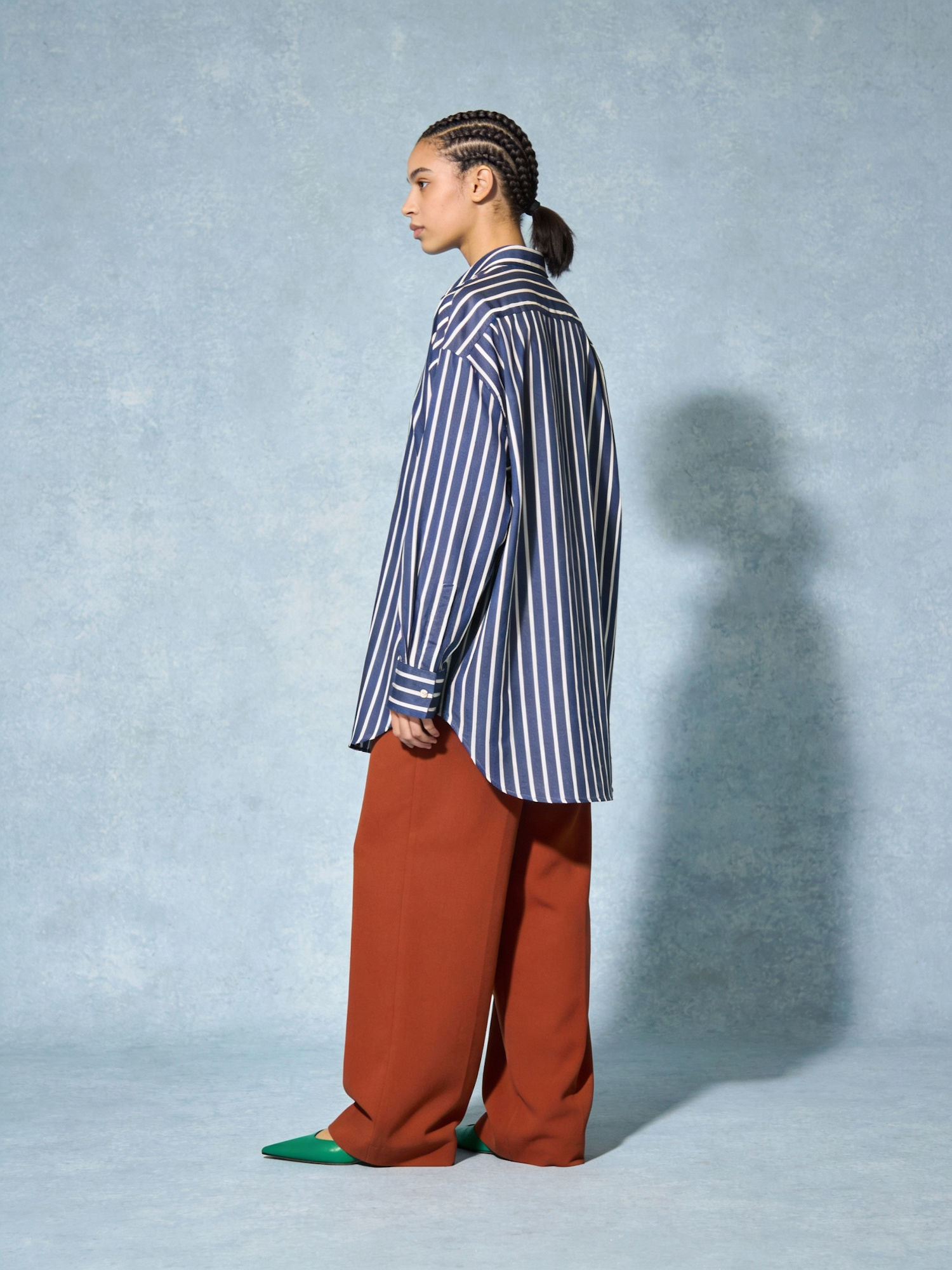 A fashion-forward individual stands in profile against a light blue textured wall, dressed in a bold, color-blocked outfit. They wear an oversized blue and white vertically striped shirt paired with rust-colored wide-leg pants and green pointed-toe flats. Their hair is styled in cornrows pulled back into a low ponytail. The composition is minimalist and editorial, with soft natural lighting casting gentle shadows to highlight the textures of the wall and the clean lines of the garments. The scene evokes Scandinavian minimalism through muted tones, confident styling, and a serene, uncluttered backdrop.