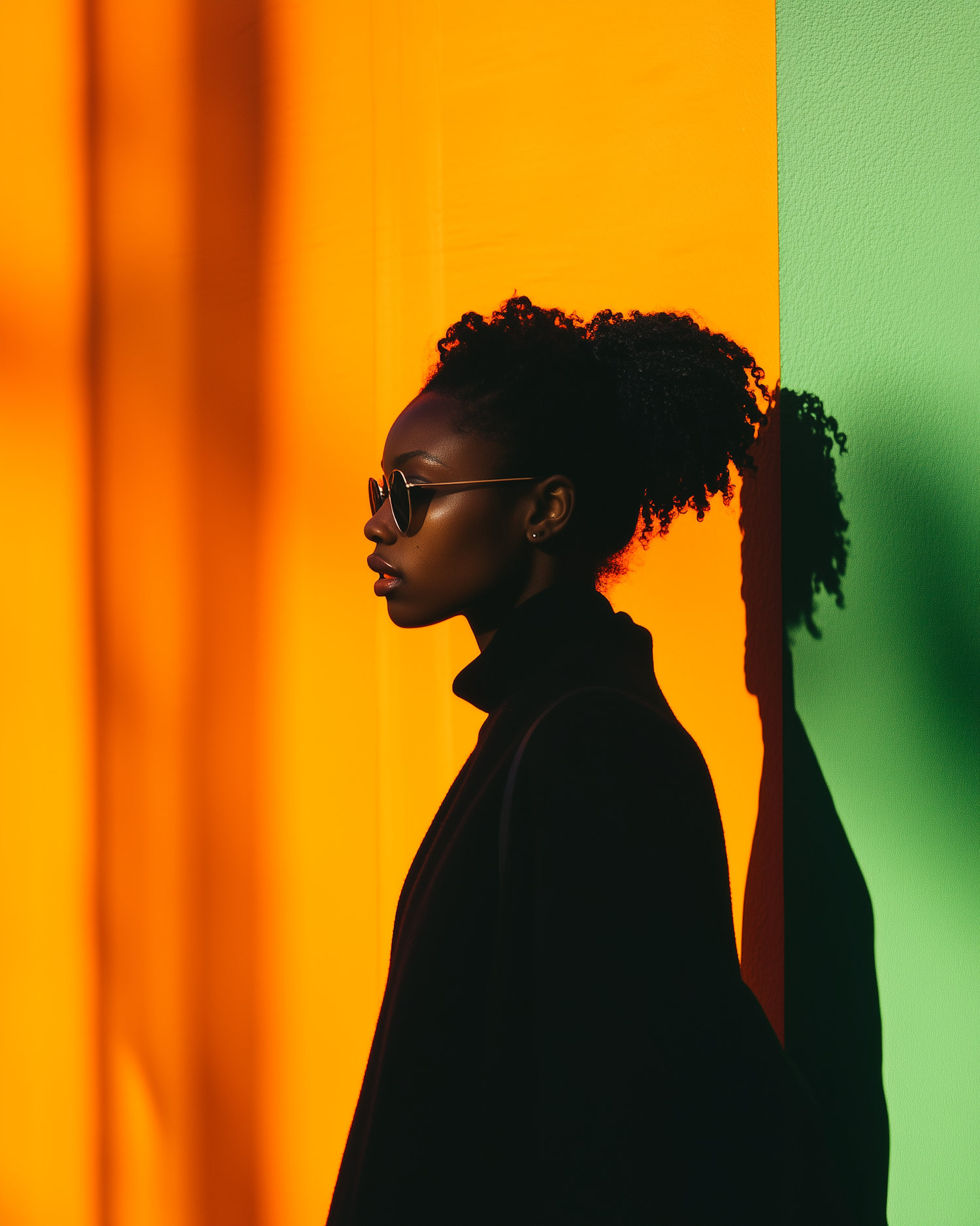 Profile of a woman in sunglasses against a vibrant orange and green background, casting a sharp shadow.