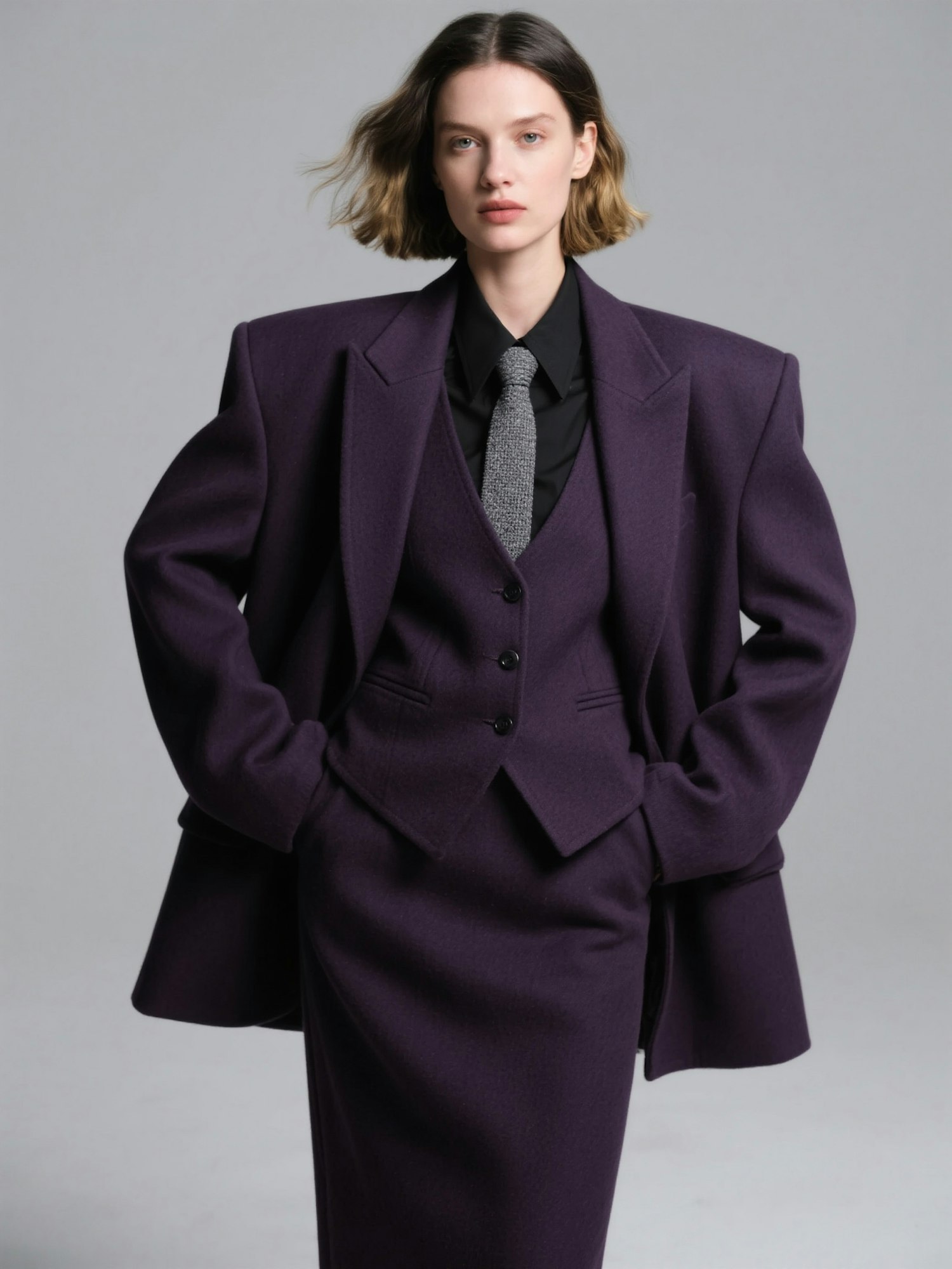 Studio fashion editorial close-up portrait of a woman with a dark blonde bob haircut, slightly wavy, exuding strength and femininity. The framing focuses on her upper body, showing the tailoring of the outfit. She is wearing an oversized very dark purple suit: a wide-shouldered blazer, a structured vest, and a matching long skirt. Underneath, she wears a fitted black shirt with a pointed collar and a textured gray tie. The fabrics appear structured and slightly heavy, emphasizing the volume and proportions of the tailoring. The background is a seamless neutral gray studio backdrop, smooth and uniform with no floor separation. Lighting is soft and evenly diffused, producing subtle shadows that define the shapes and textures of the fabrics. The art direction is minimal, modern, and editorial, focusing on presence, attitude, and the impact of deep-colored oversized tailoring.