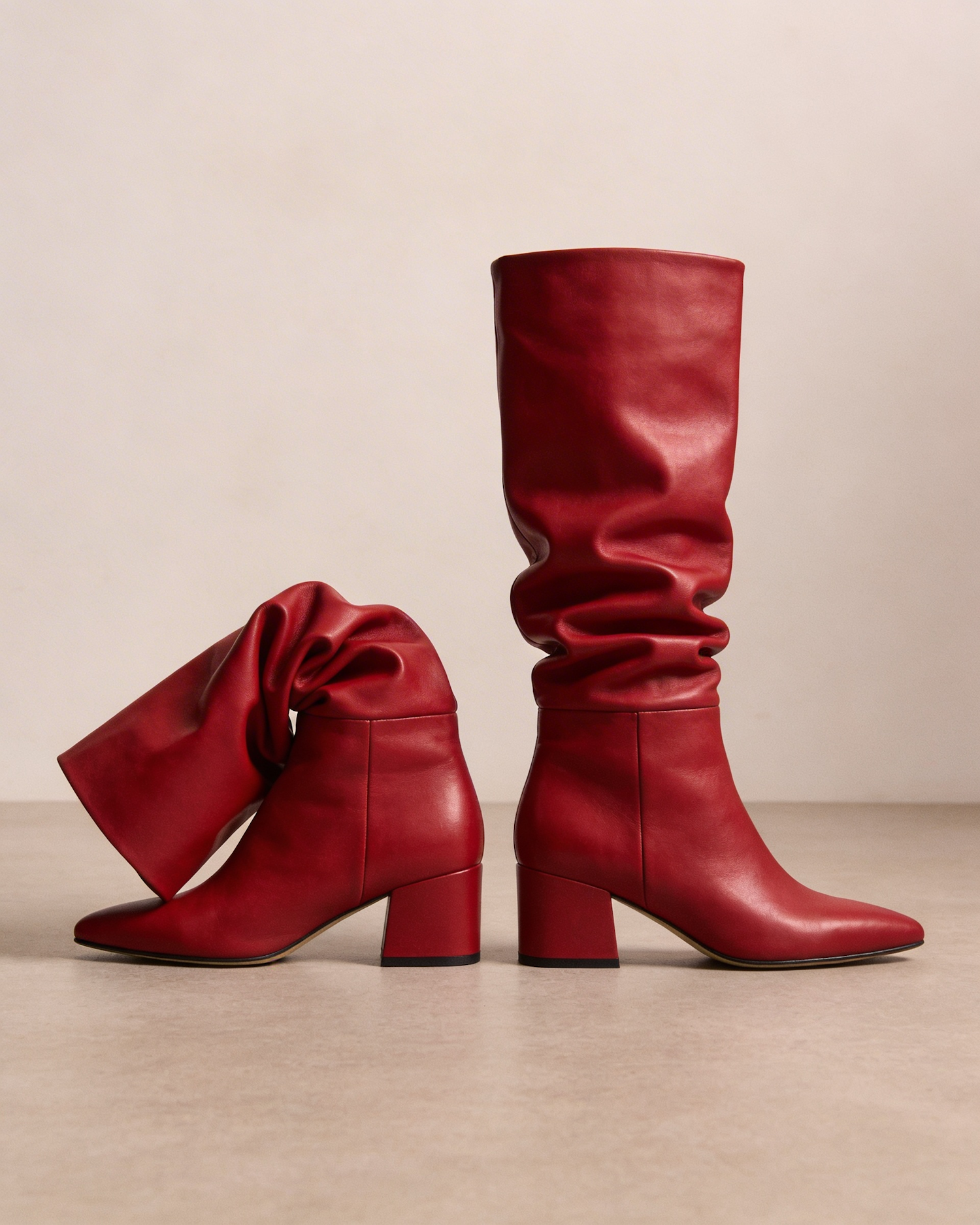 Elegant red leather boots with a slouchy design and block heels, perfect for a bold and stylish look.