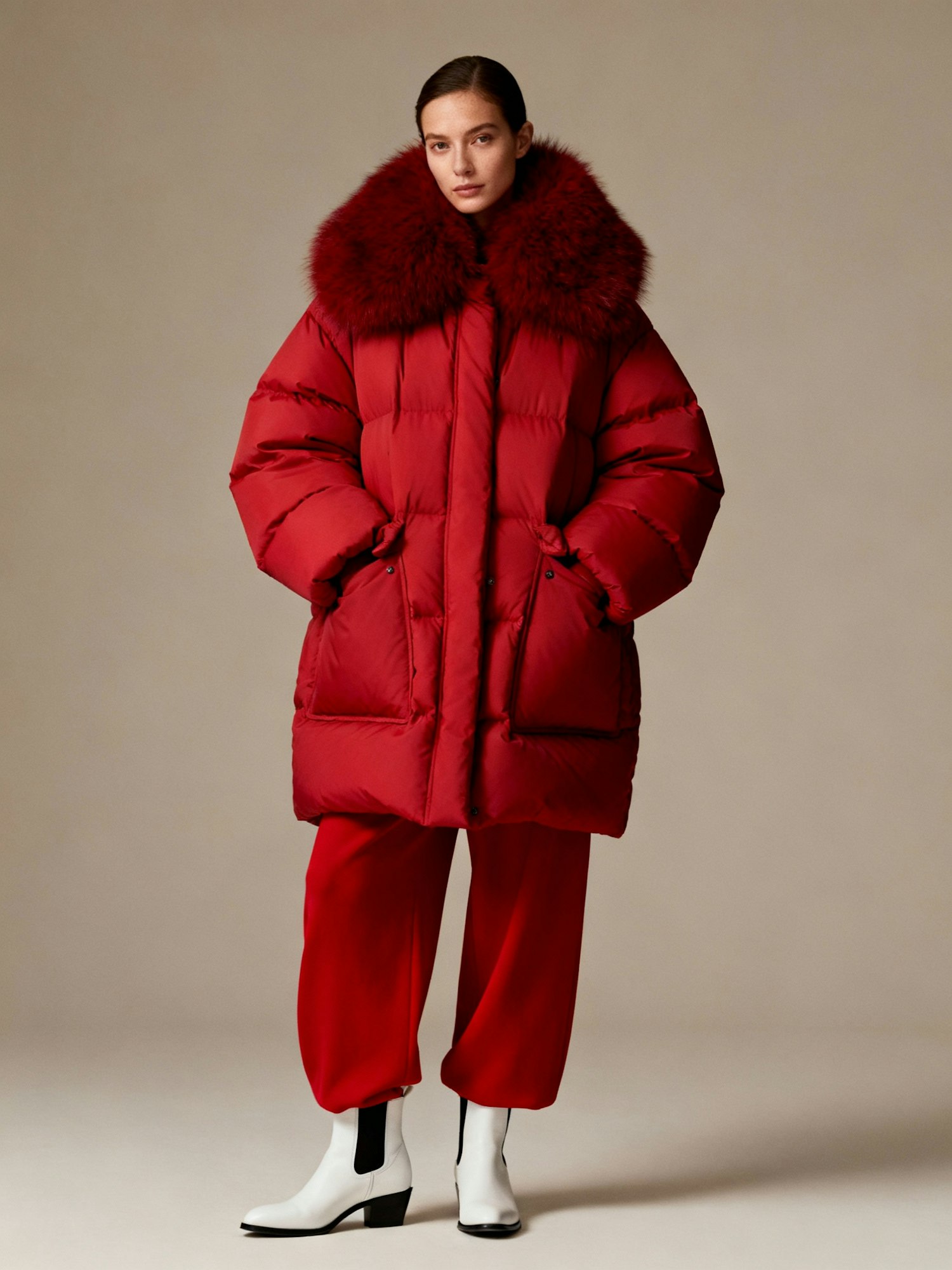 A person in a red puffer coat with a fur collar, red pants, and white boots, standing against a neutral background.