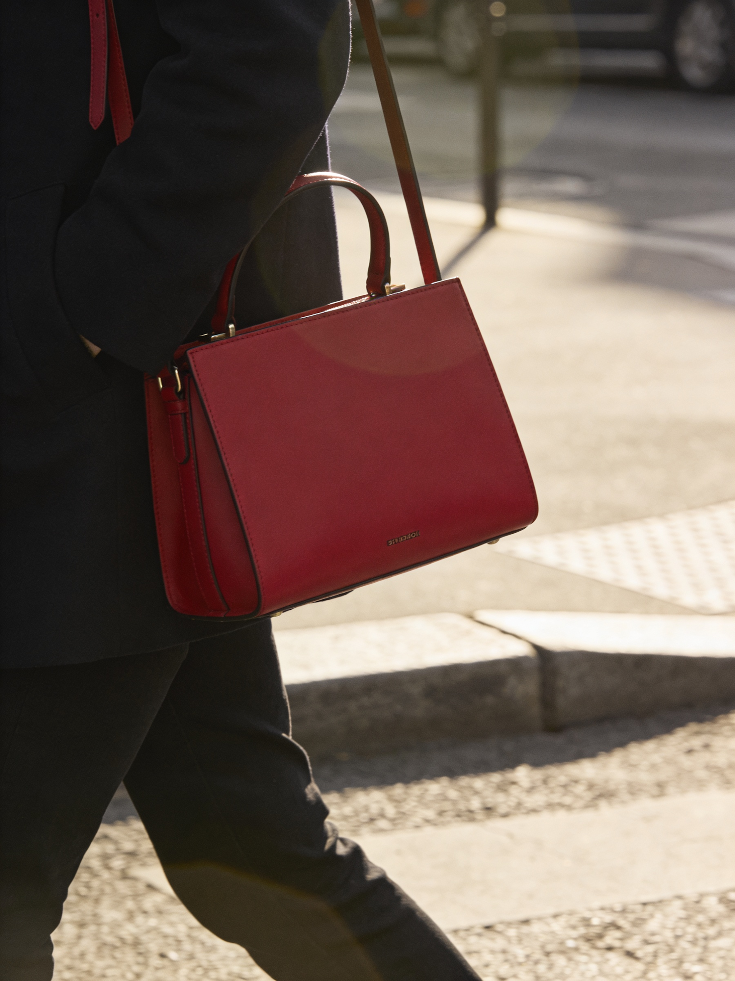 A stylish red handbag carried by a person in a city street setting, with sunlight adding a warm touch to the scene.