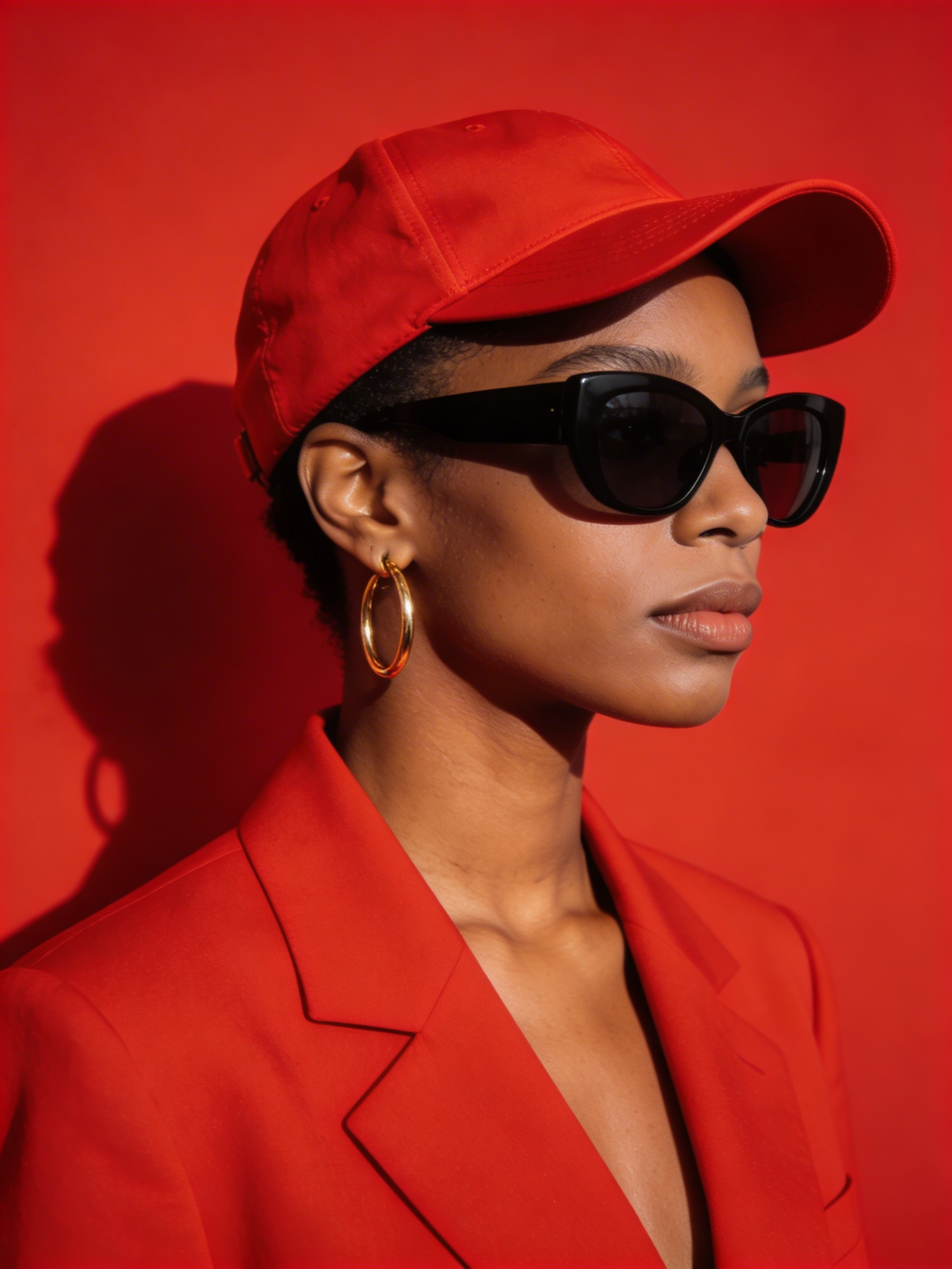 A high-definition, colour-saturated portrait of a Black woman standing confidently against a fully red backdrop. She wears a monochromatic red outfit: a structured red blazer with clean tailoring, a red baseball cap, large black oversized sunglasses, and gold hoop earrings. Her expression is calm and self‑assured. The lighting is dramatic and studio‑crisp, creating rich shadows and vibrant highlights. The entire scene is bold, modern, and fashion‑editorial, with the red tones popping intensely across the frame.