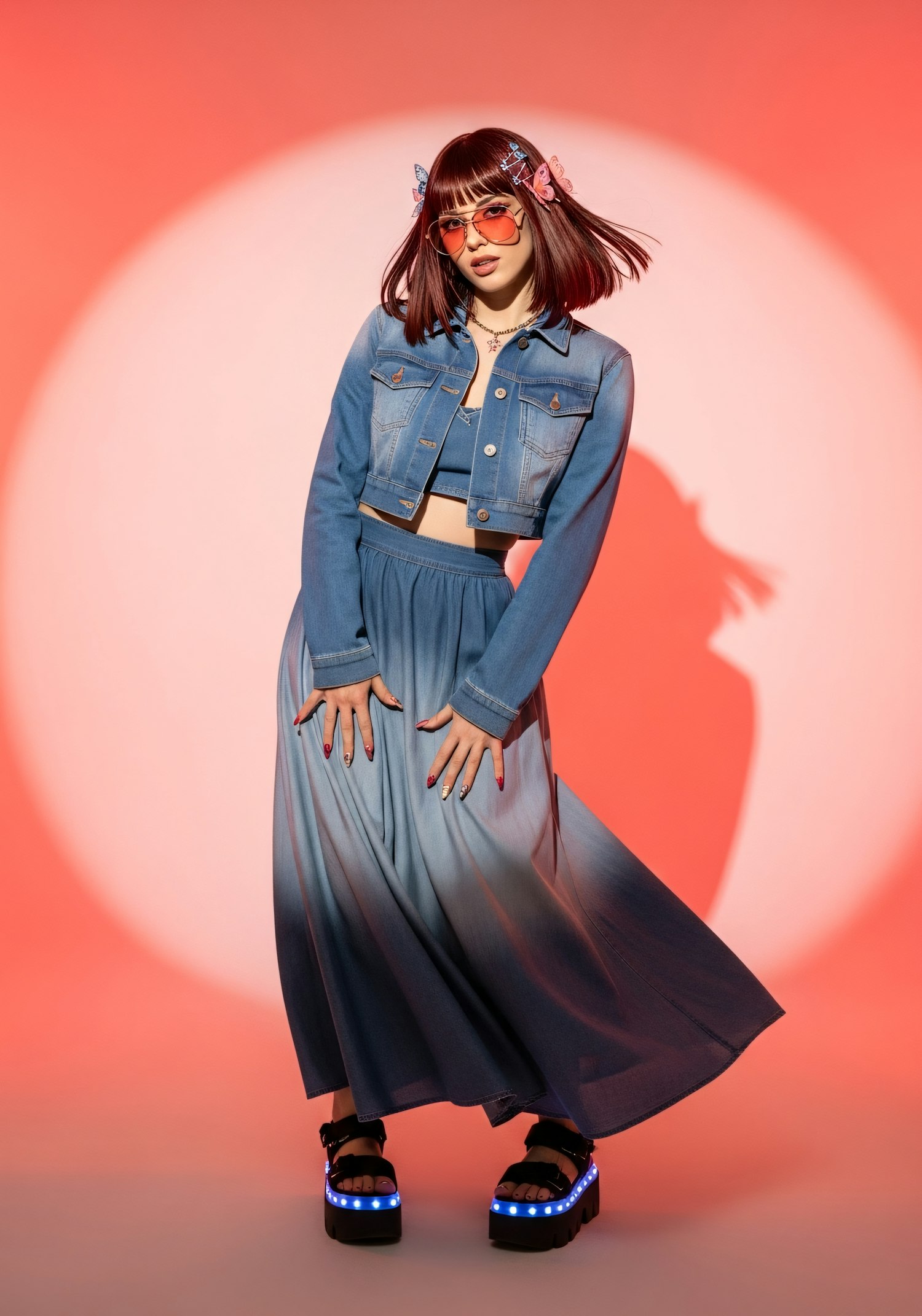 A fashionable individual in a denim outfit and LED platform sandals poses against a red backdrop, showcasing a modern and playful style.