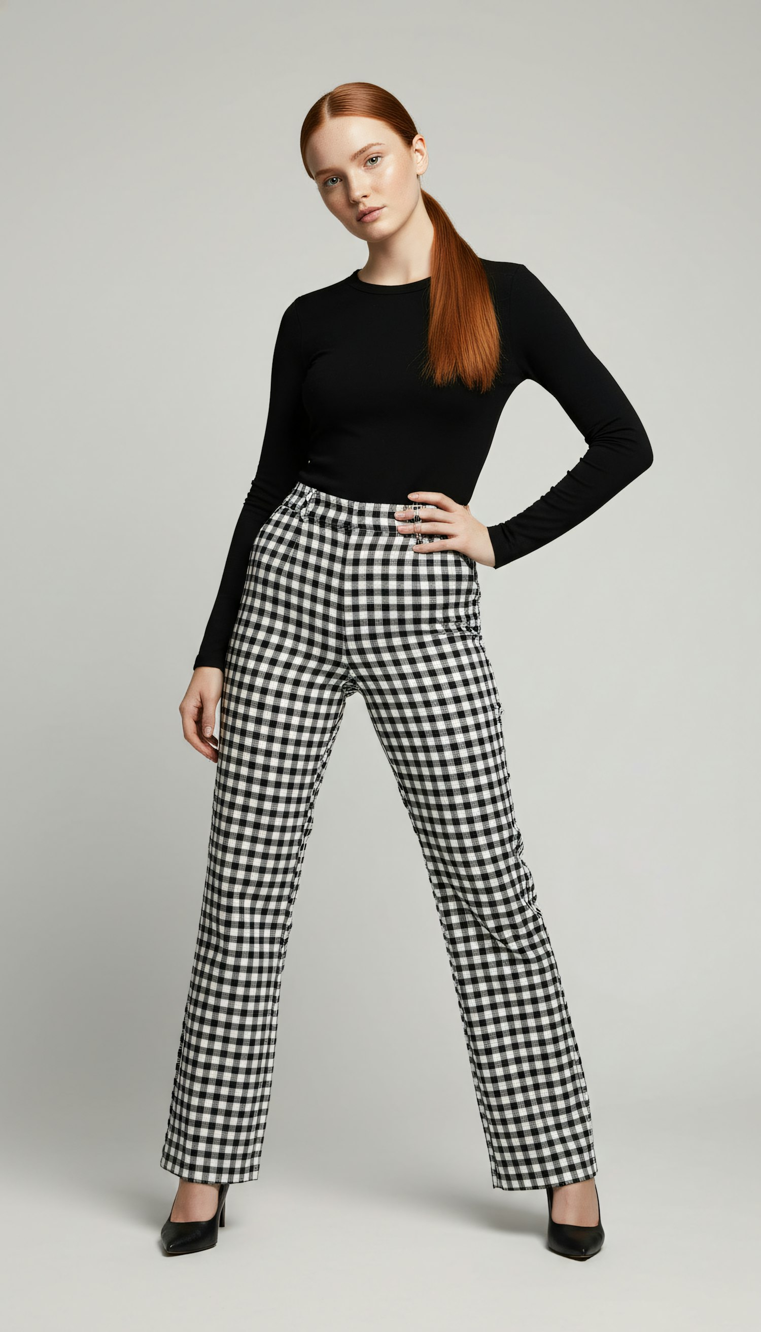 A stylish individual in a black top and checkered pants poses confidently against a neutral background.