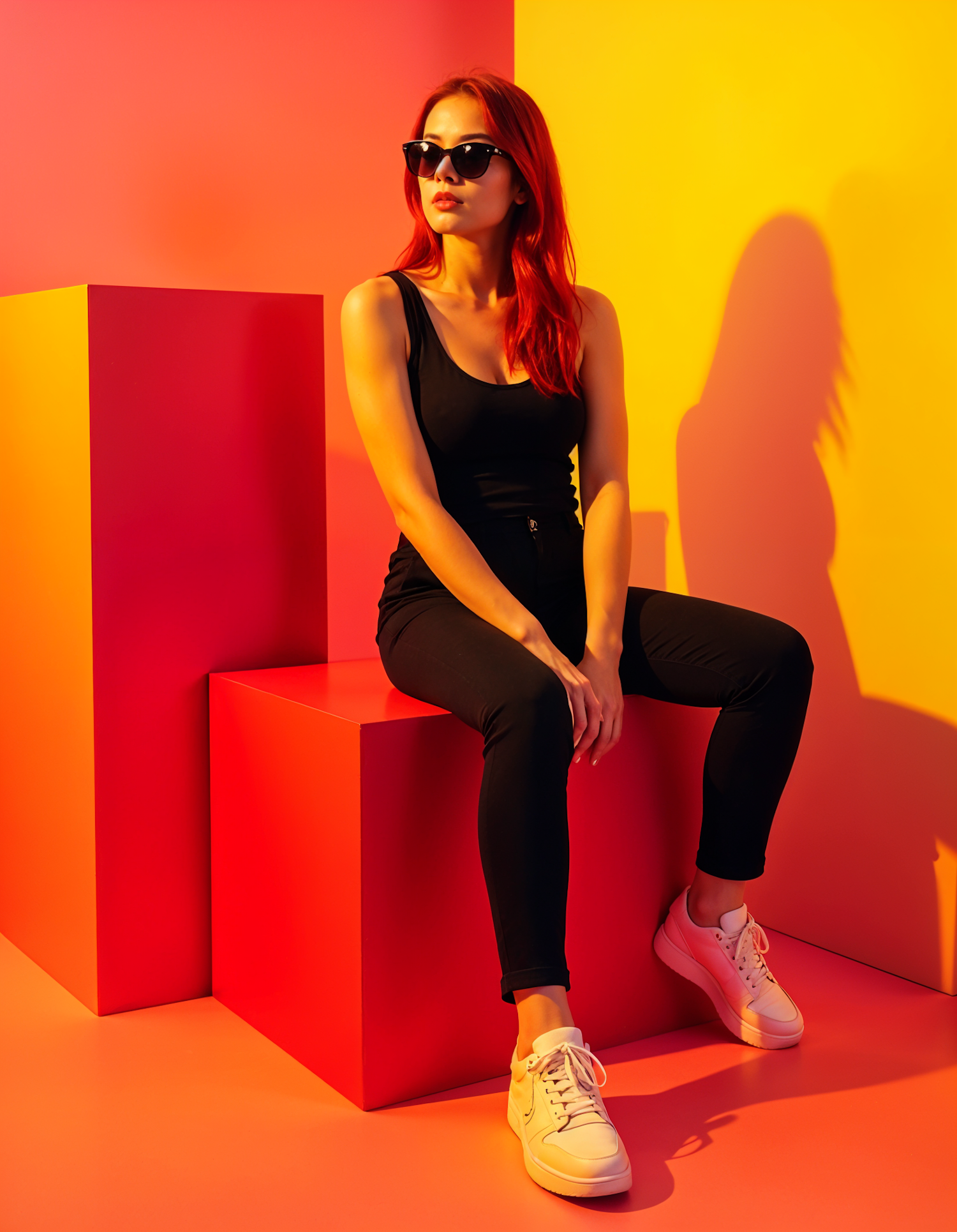 Stylish woman with red hair in black outfit and sunglasses sits on a red cube against a bold yellow and pink background.