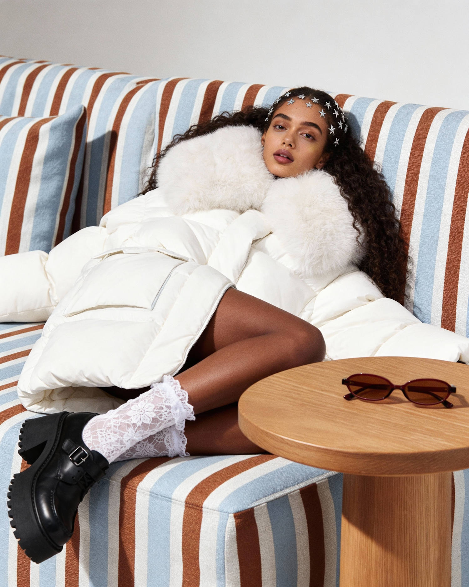 A fashionable person in a white coat and lace socks relaxes on a striped sofa, with sunglasses on a wooden table nearby.