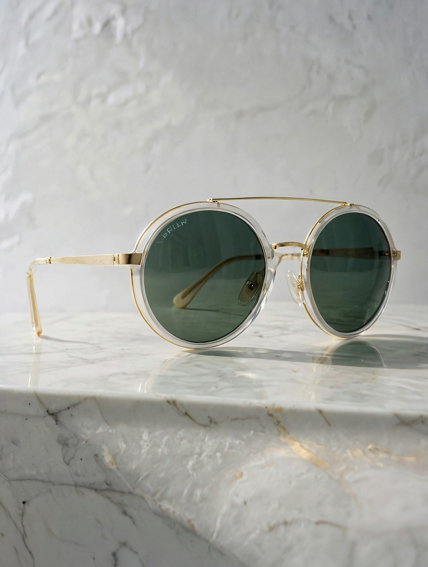 Elegant round sunglasses with gold frames and green lenses on a polished marble surface, perfect for a chic and modern look.