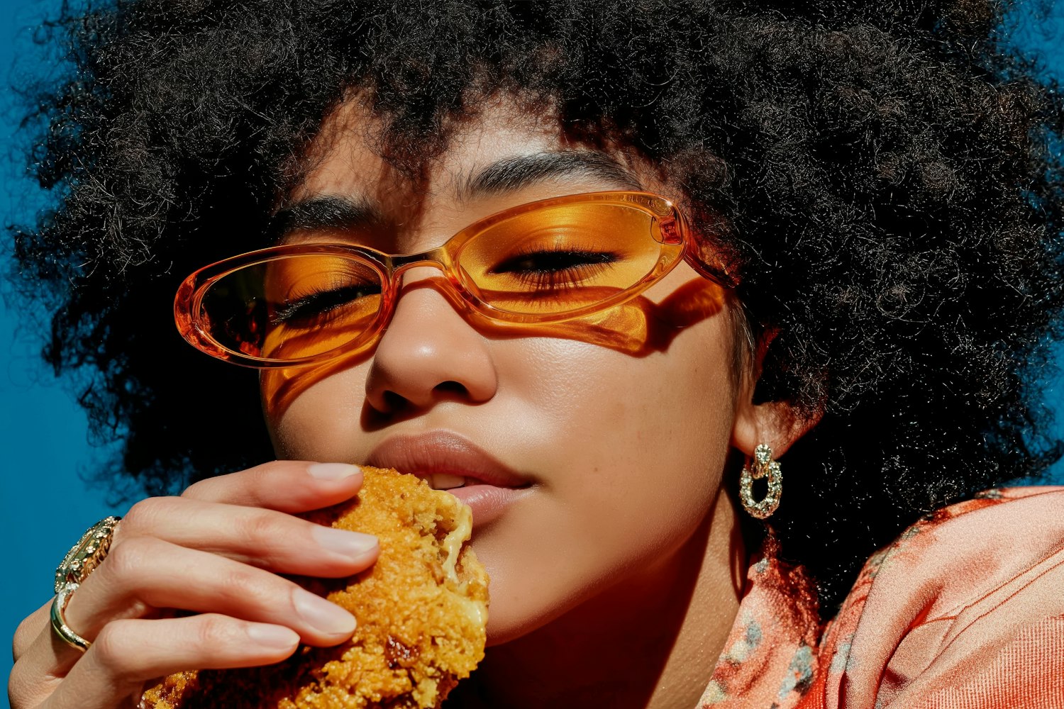 A stylish individual with orange sunglasses enjoys a crispy sandwich against a vibrant blue background, showcasing bold colors and textures.