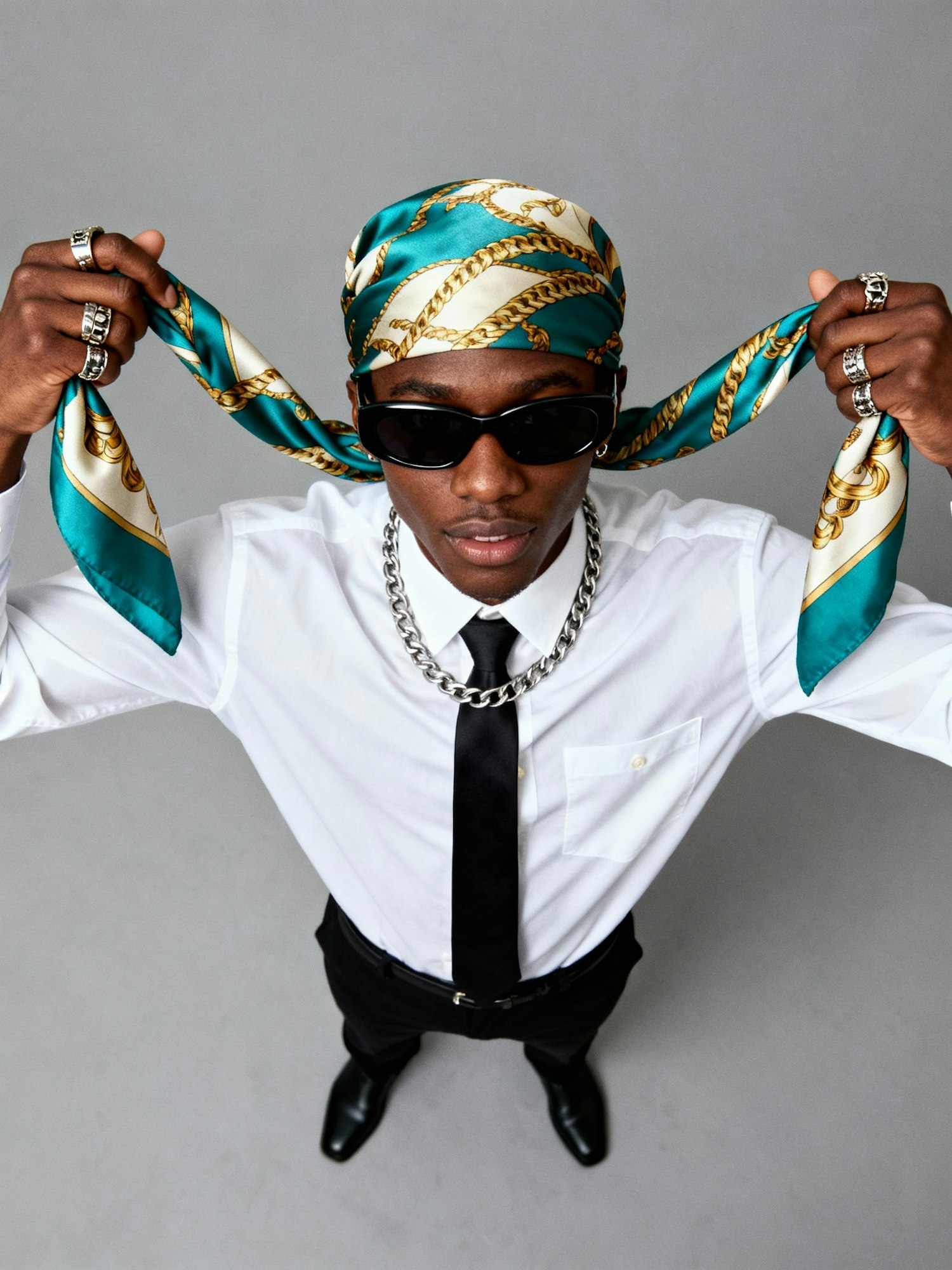 Waist-up, high-definition portrait of a Black person wearing a white button-up shirt, black tie, and large black sunglasses. A patterned silk scarf in teal, gold, and cream is draped over the head and held at both ends. Accessories include multiple rings and a chain necklace. The pose is confident and expressive. The neutral gray background enhances the white and black tones of the outfit and the intricate scarf pattern, making the layered textures stand out. Lighting is soft and directional, casting gentle highlights across the face and accessories. The mood is tailored, expressive, and editorial—ideal for an Afro-fusion fashion portrait or scarf-focused identity showcase.