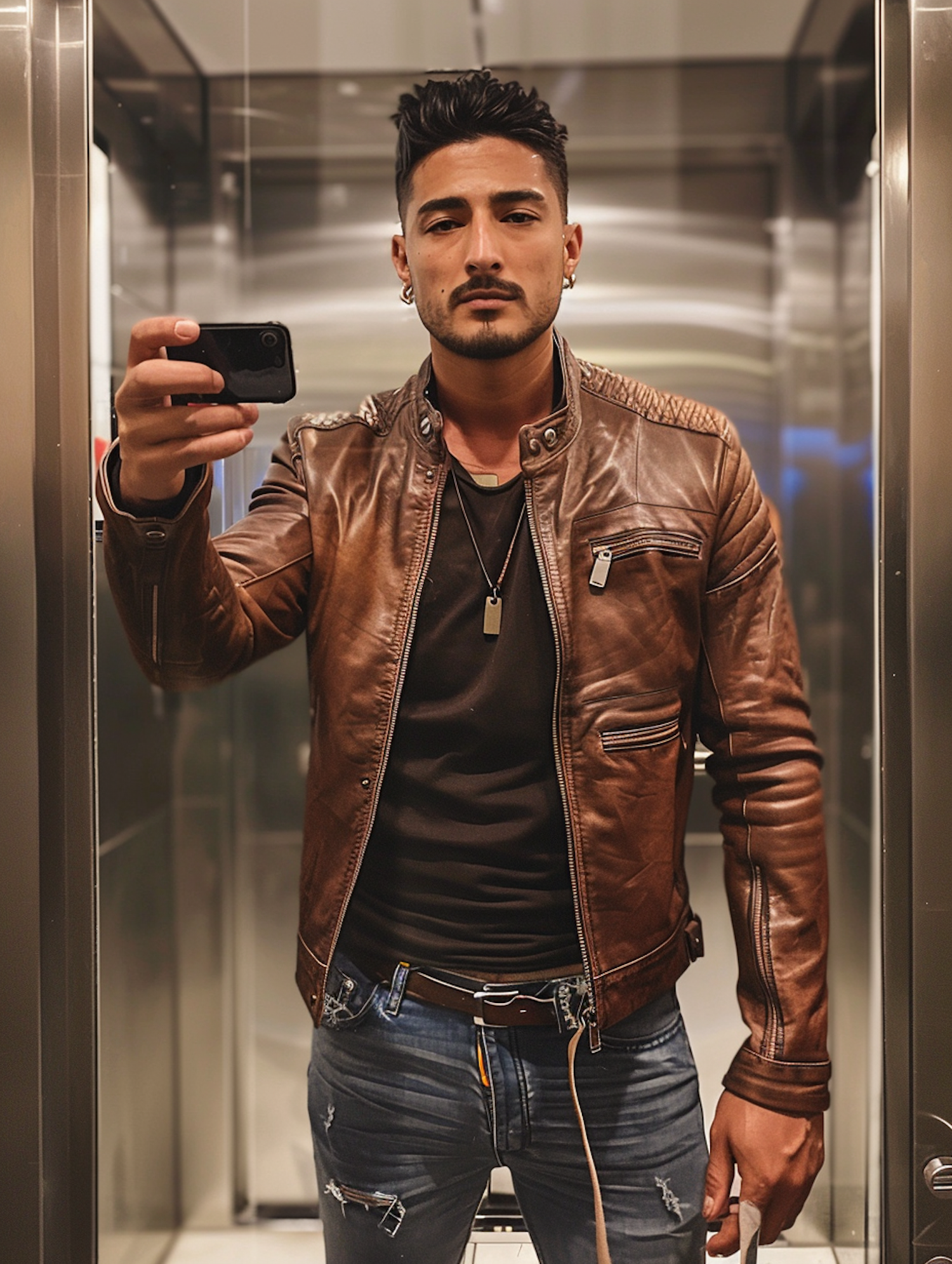 Man in brown leather jacket takes a selfie in an elevator, showcasing a stylish look with distressed jeans and accessories.