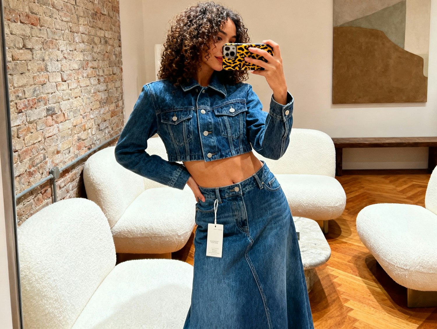 Stylish individual in a denim outfit takes a selfie in a modern room with brick walls, white chairs, and wooden flooring.