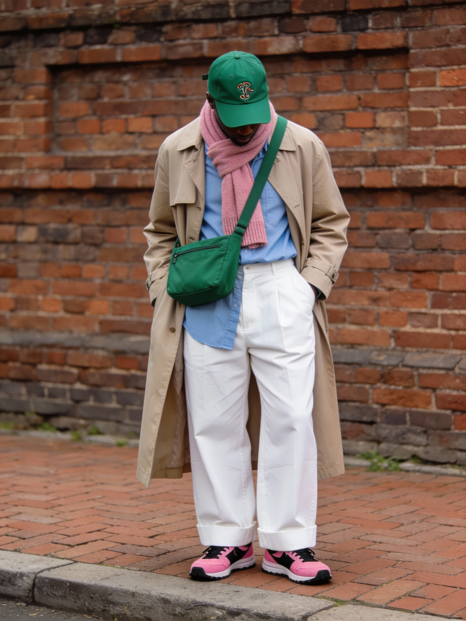 A fashion-forward Black individual stands on a brick-paved sidewalk in front of a textured brick wall, dressed in layered garments that blend casual streetwear with Scandinavian editorial minimalism. They wear a long beige trench coat over white wide-legged pants and a light blue shirt. A pink scarf is wrapped around the neck, paired with a green crossbody bag and a green baseball cap with embroidered detail. Pink and black sneakers complete the look. The subject’s head is slightly lowered, with the face partially obscured by the cap, adding a sense of quiet introspection. The lighting is soft and natural, casting gentle shadows across the outfit and the brick textures. The composition is editorial and composed, emphasizing color contrast, layering, and urban serenity