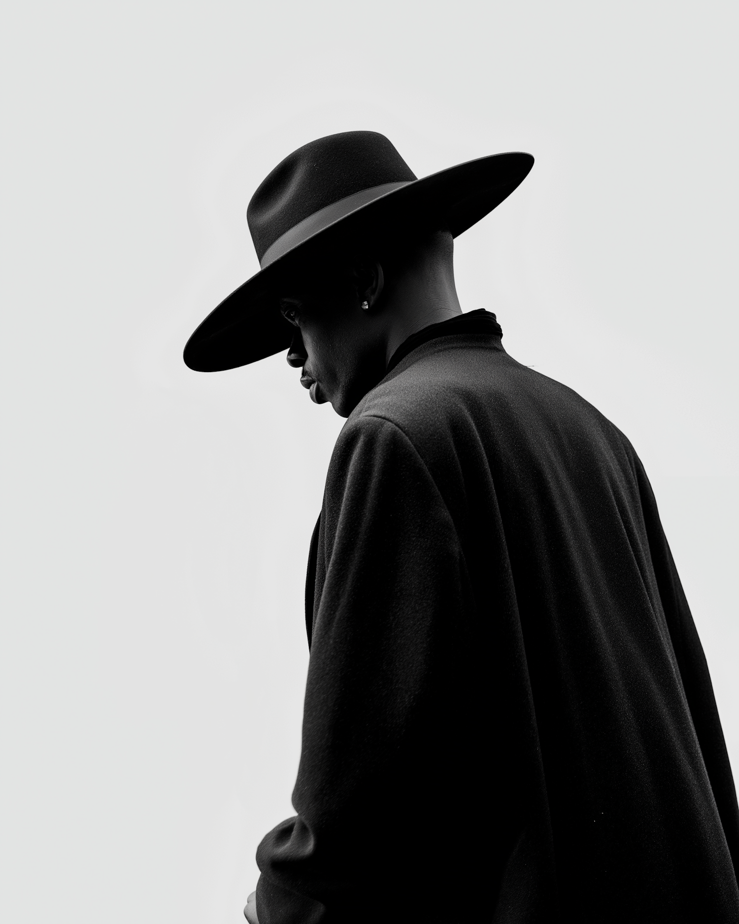 A profile of a person in a black wide-brimmed hat and coat, creating a minimalist, modern, and dramatic black-and-white look.