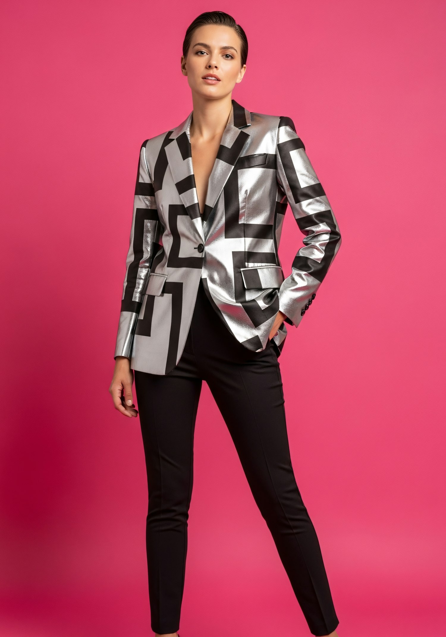 Stylish individual in a silver geometric blazer and black pants against a vibrant pink backdrop, exuding modern fashion vibes.