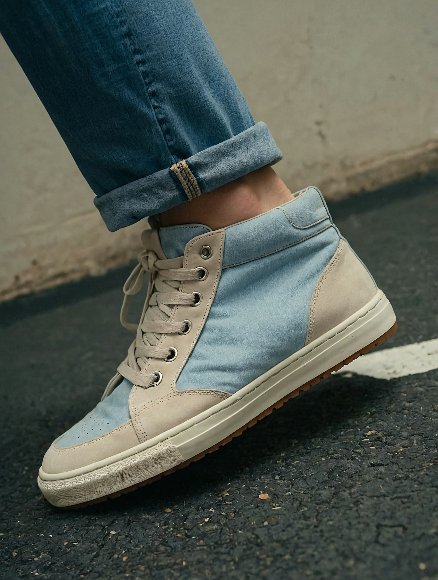 Close-up of a light blue and beige sneaker paired with rolled-up denim jeans on an asphalt background, showcasing casual urban style.