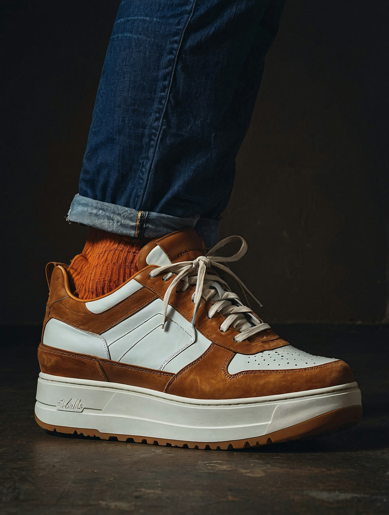 Stylish brown and white sneaker with orange socks and rolled-up jeans, set against a dark background.