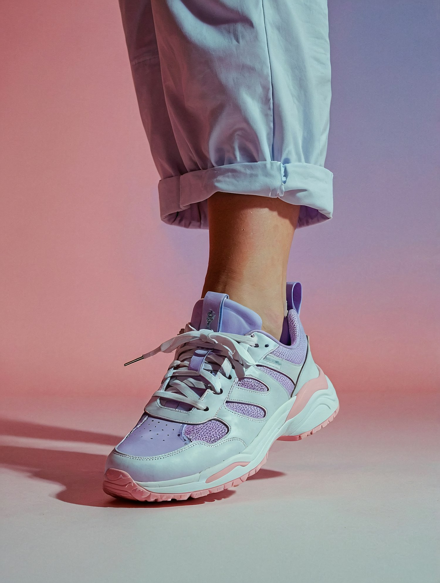 Stylish light purple sneaker with pink sole and white accents, paired with rolled-up light blue pants against a pink-purple gradient.