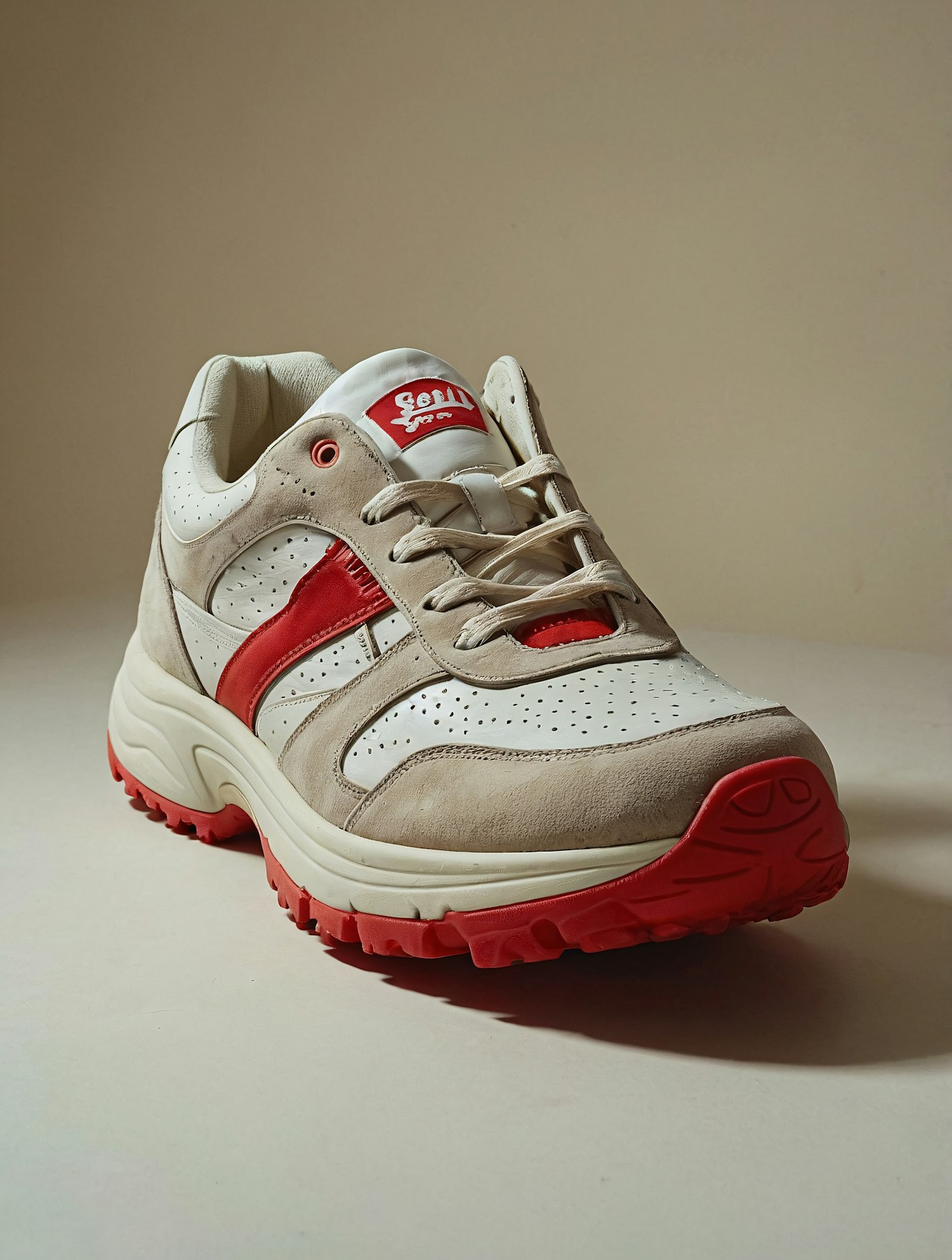 Stylish sneaker with beige, white, and red accents, featuring a rugged sole and branded tongue label. Modern and appealing design.