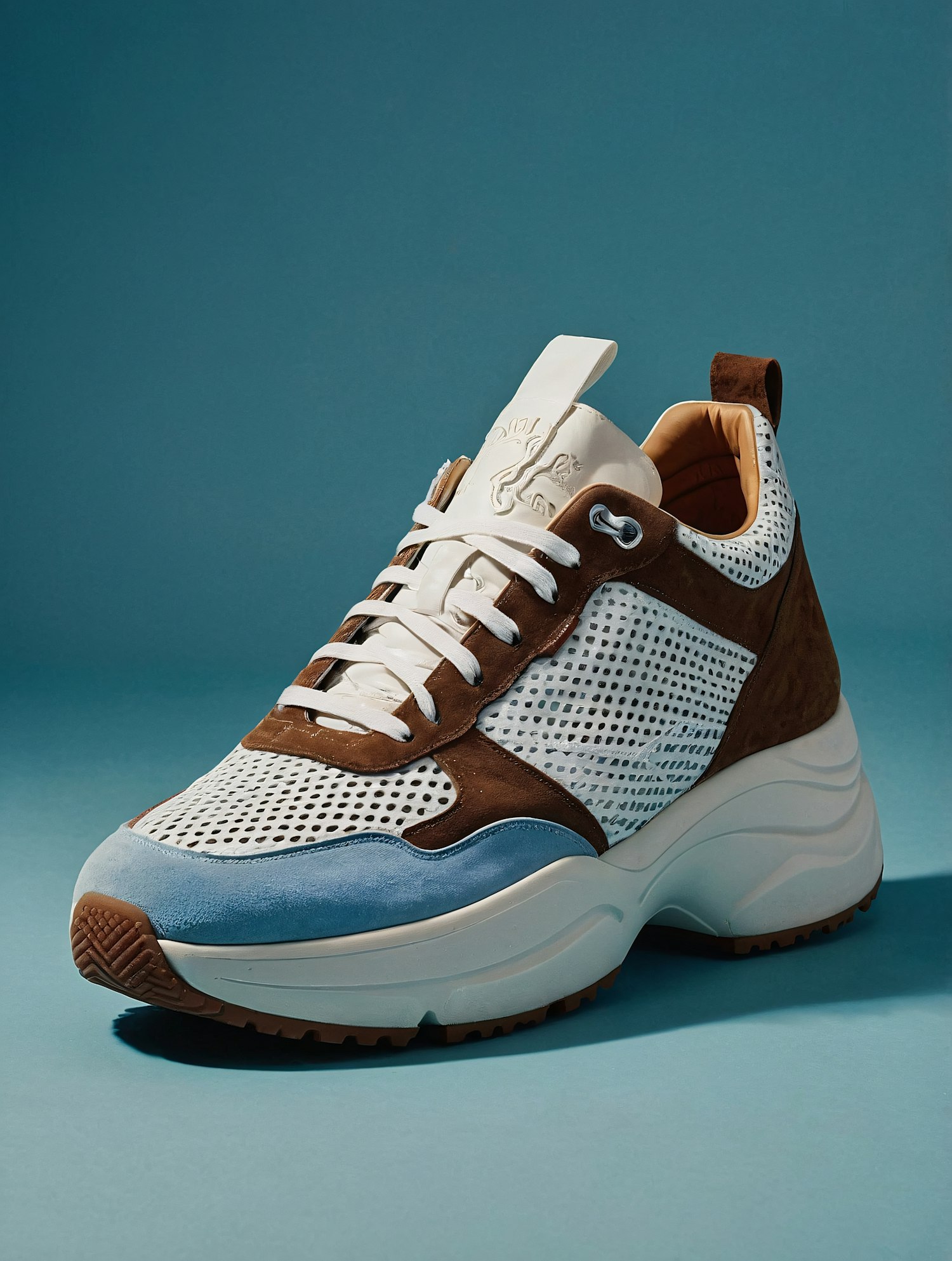 Modern sneaker with white mesh, brown suede, and blue leather accents on a teal background. Stylish and contemporary design.