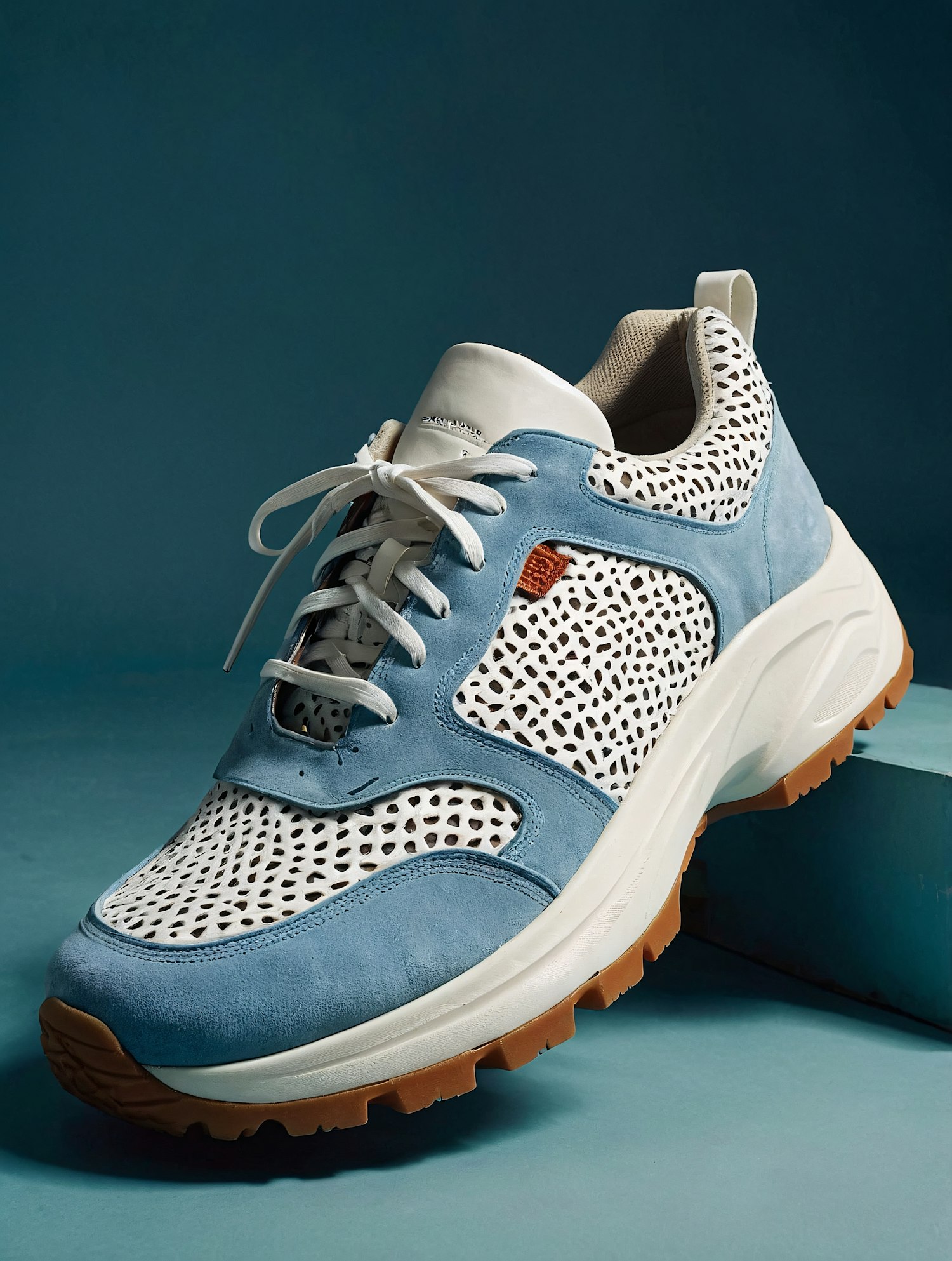Stylish sneaker with light blue suede and white perforated leather, featuring a chunky sole and brown rubber outsole against a teal background.