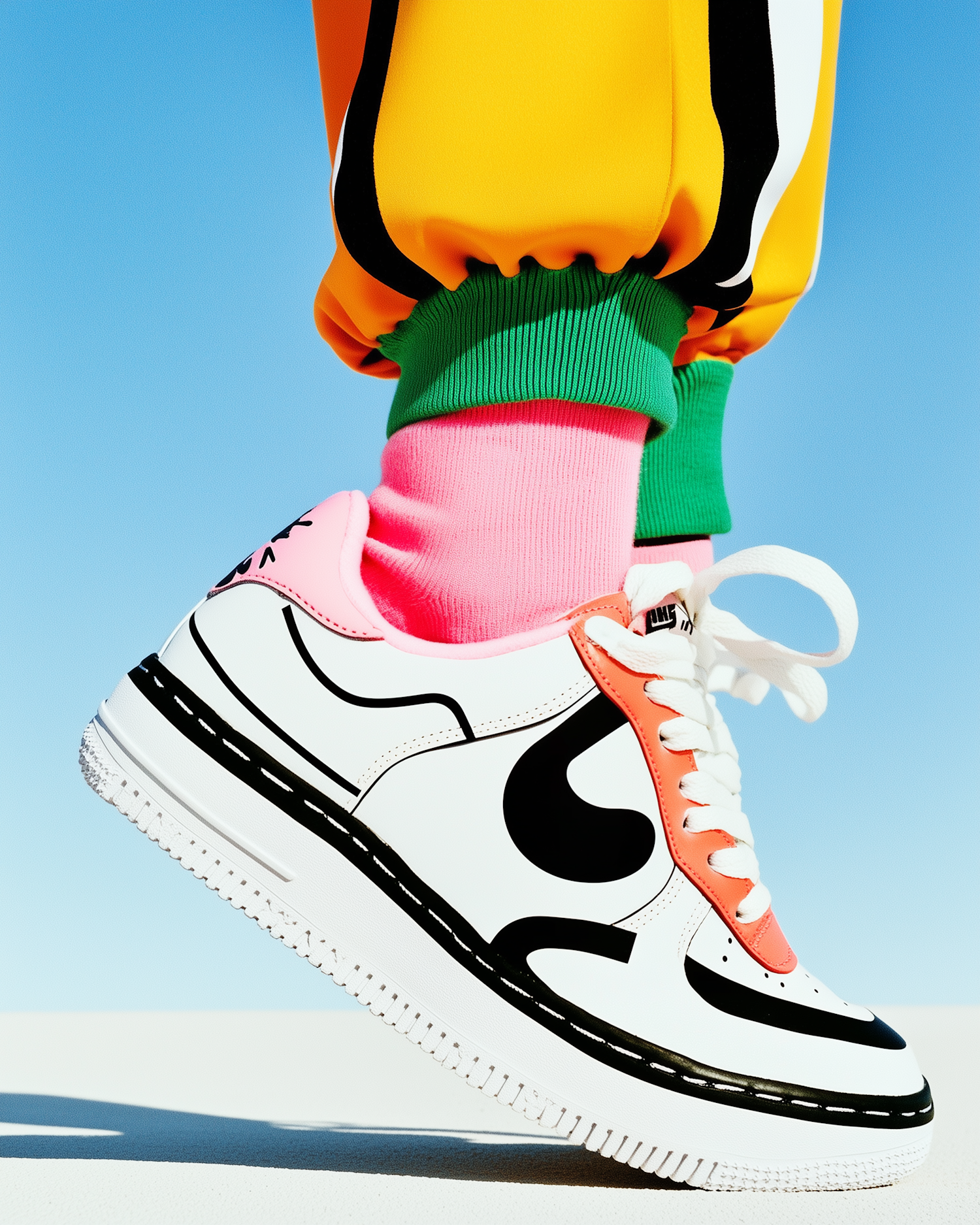 Bold sneakers with black and coral accents paired with pink socks and yellow pants, set against a clear blue sky for a vibrant look.