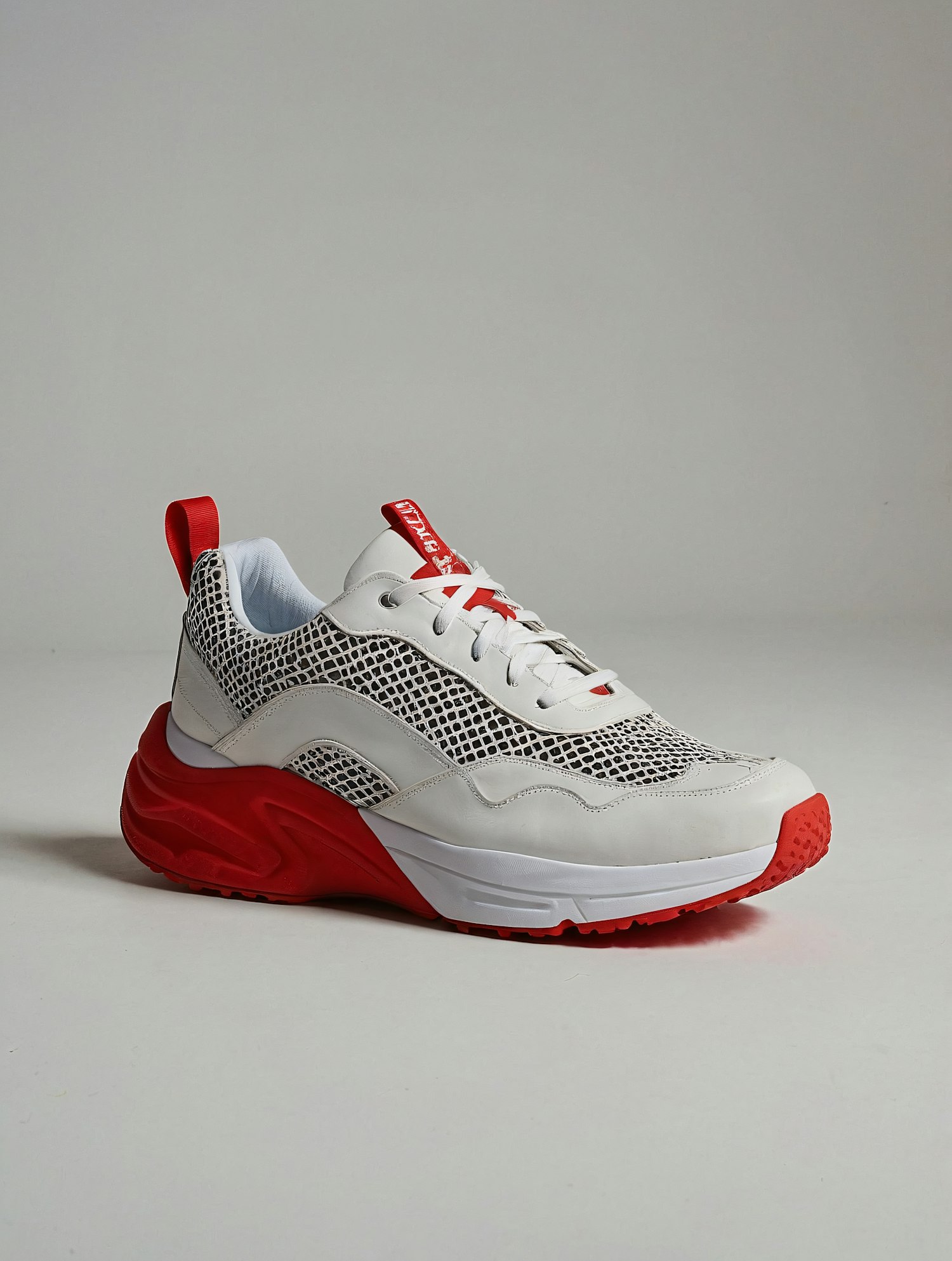 Trendy sneaker with white, black mesh, and red accents. Features a bold red sole and stylish design, perfect for casual wear.