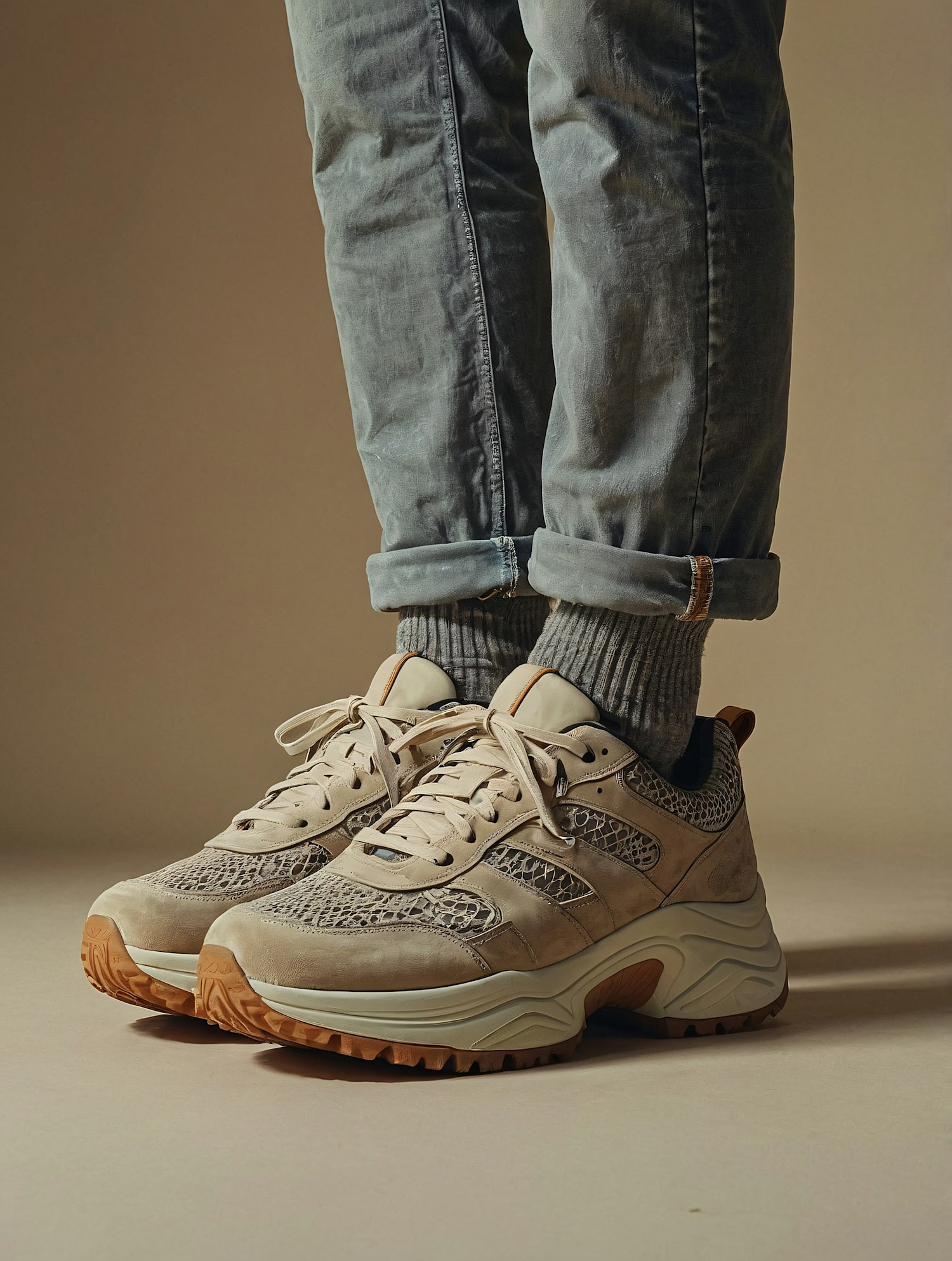 Stylish beige sneakers with textured patterns and rugged soles, paired with rolled-up jeans and gray socks against a neutral background.