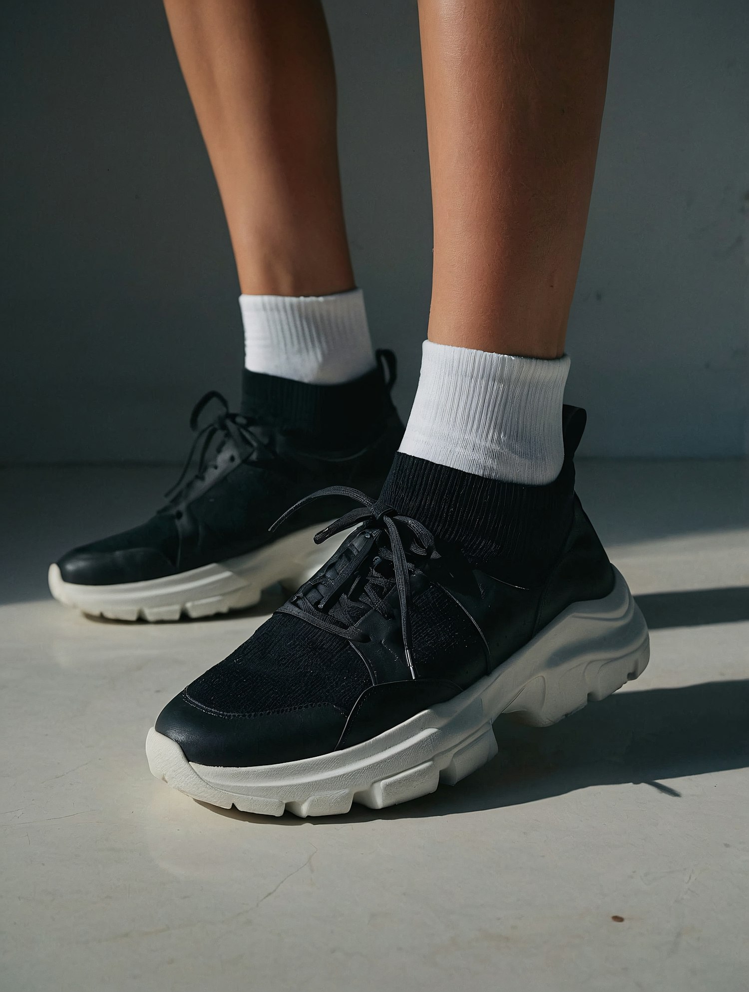 Close-up of black chunky sneakers with white soles paired with white socks, set against a minimalistic background.
