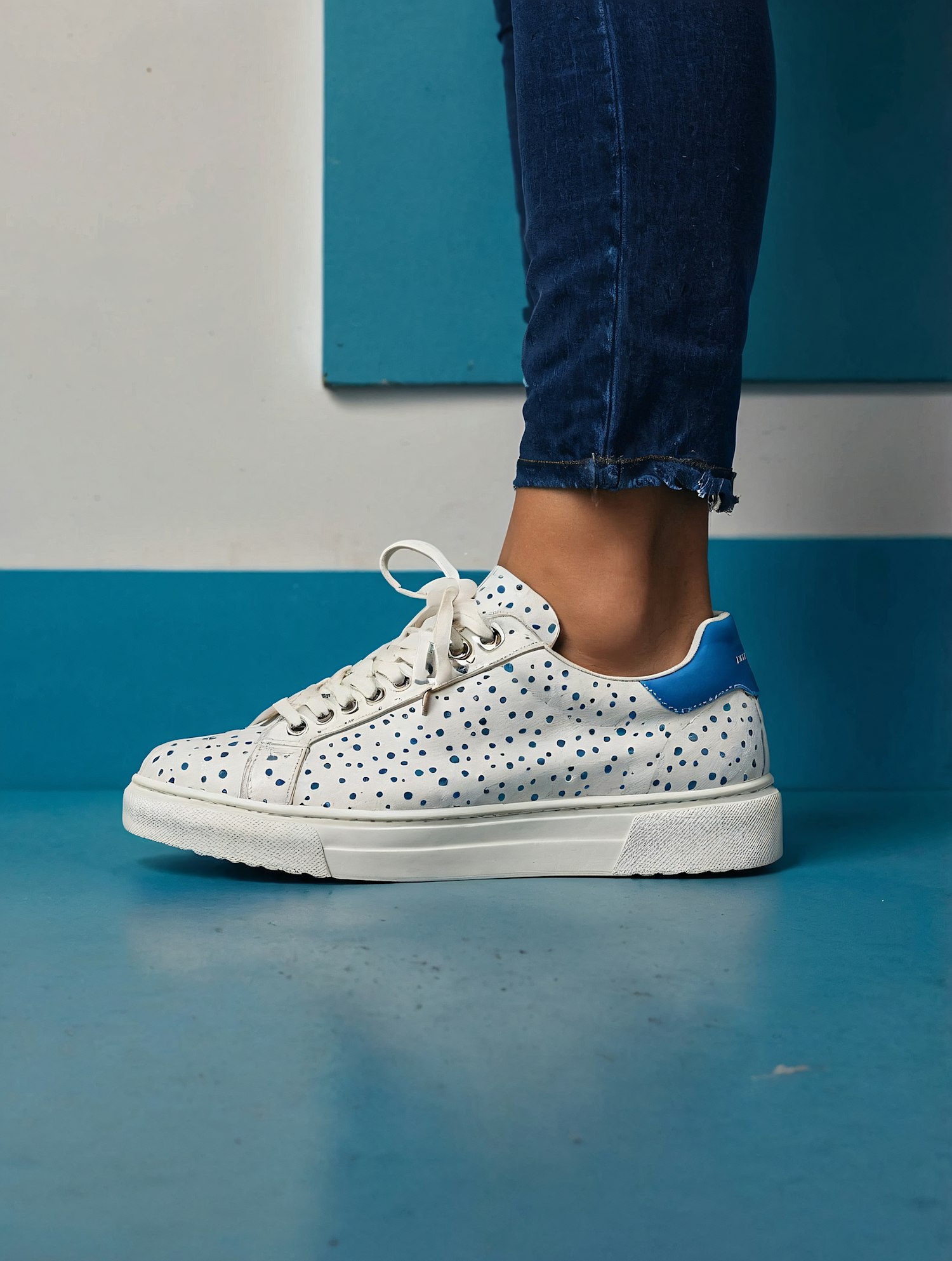 Stylish white sneakers with blue polka dots and a blue heel accent paired with frayed dark blue skinny jeans on a blue and white backdrop.