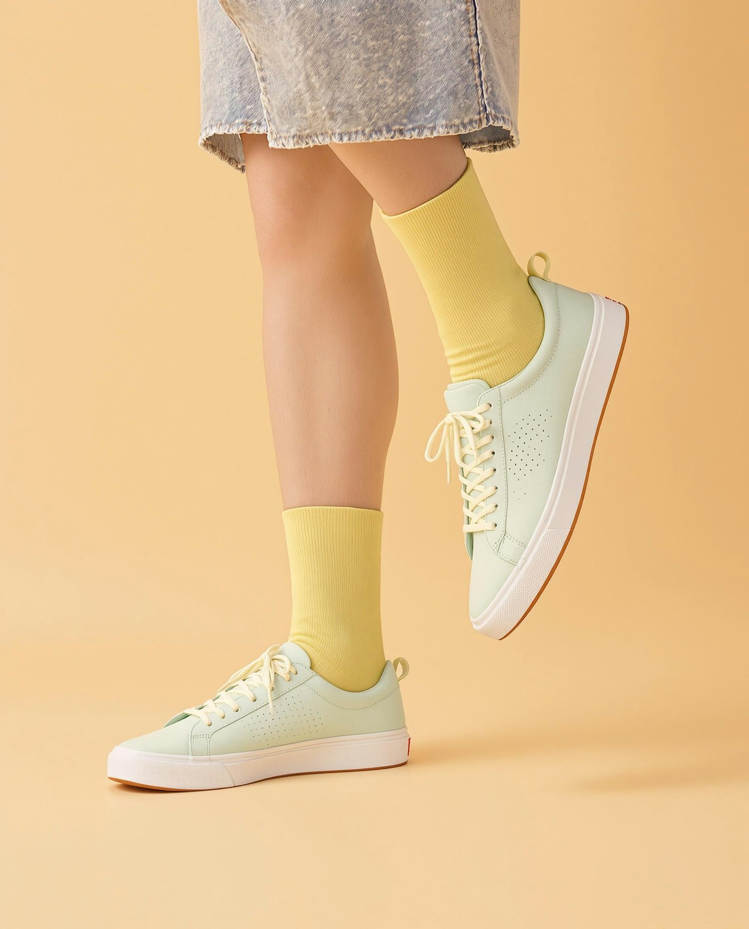 Stylish light green sneakers paired with bright yellow socks, set against a pastel yellow background for a vibrant and modern look.