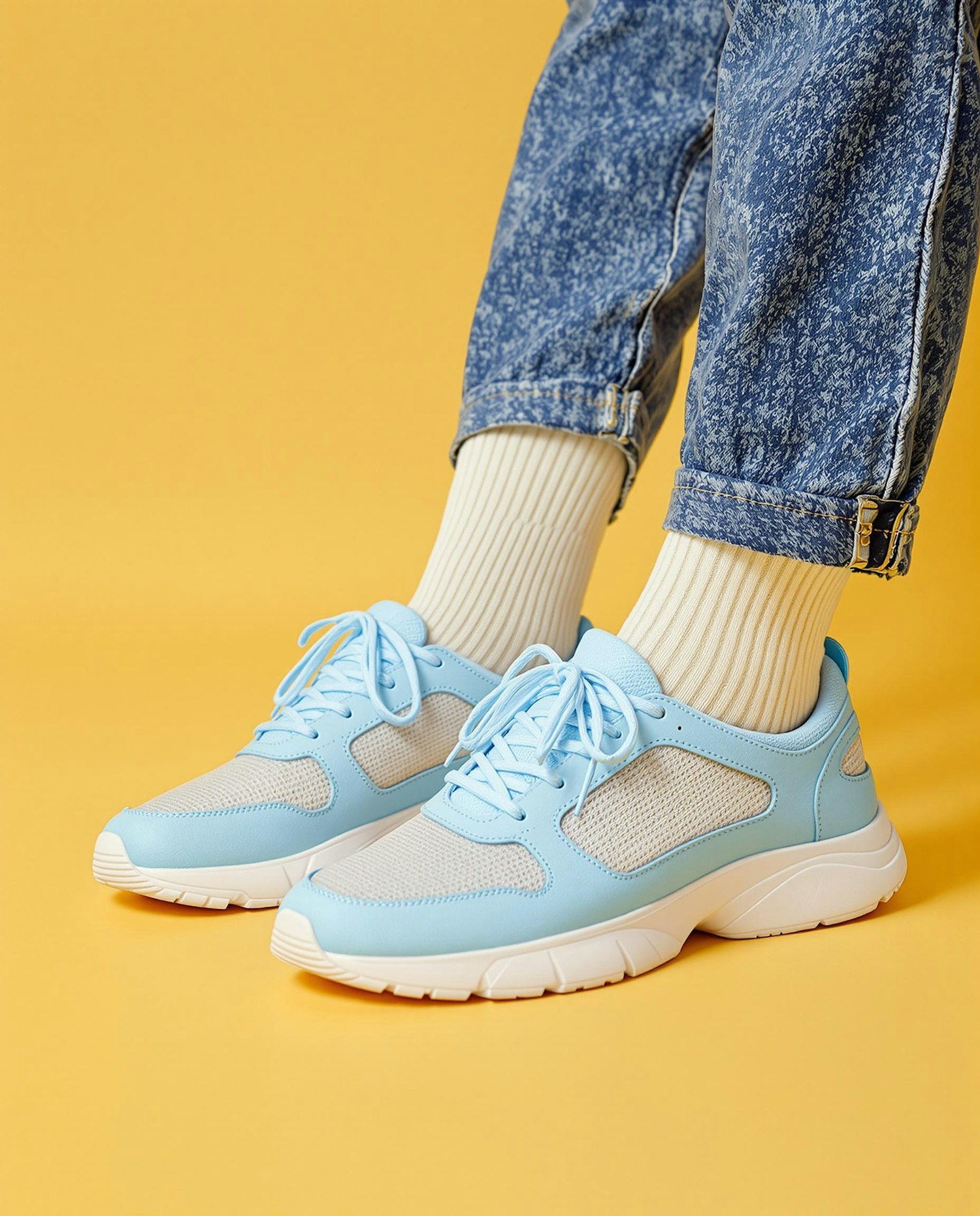 Stylish light blue sneakers paired with cream socks and rolled-up acid-wash jeans against a bright yellow background.