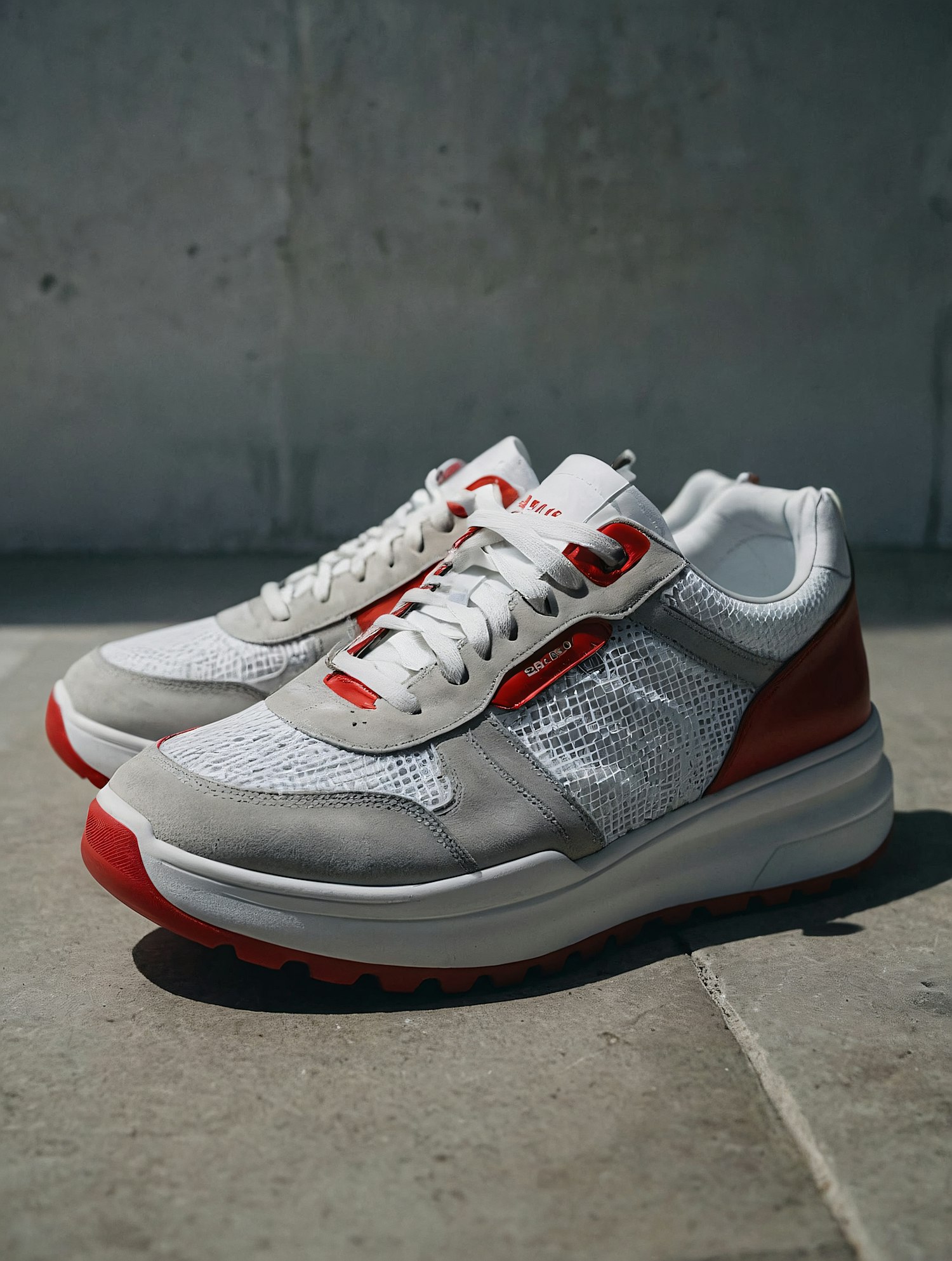 Trendy sneakers with white mesh, gray suede, and bold red accents on a chunky sole, perfect for a modern and sporty look.