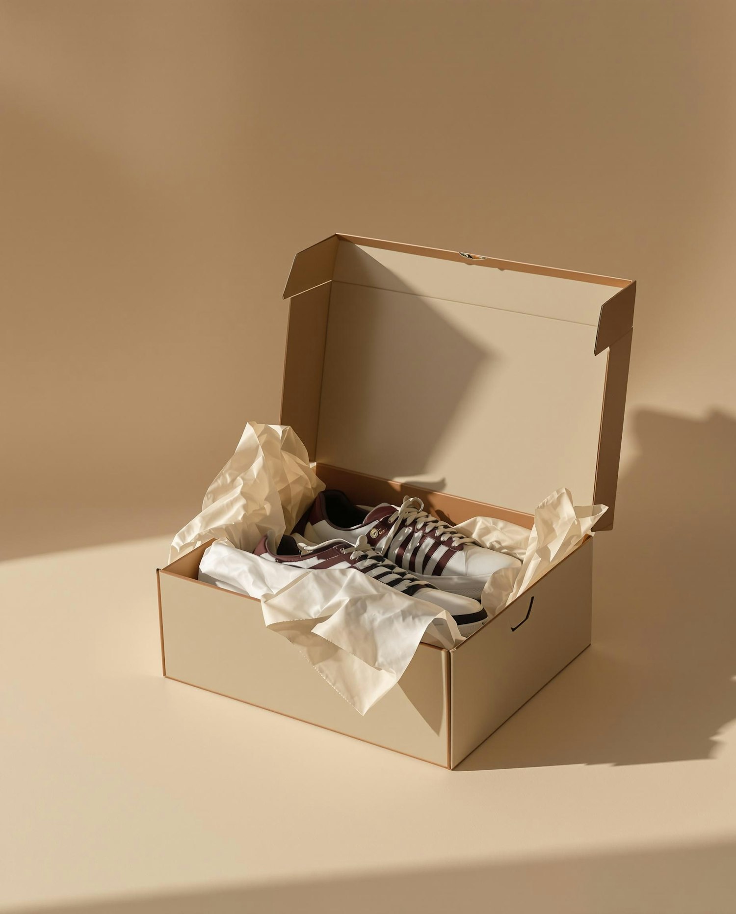 Minimalist sneaker display in a beige box with maroon and black accents, soft natural lighting, and elegant tissue paper lining.