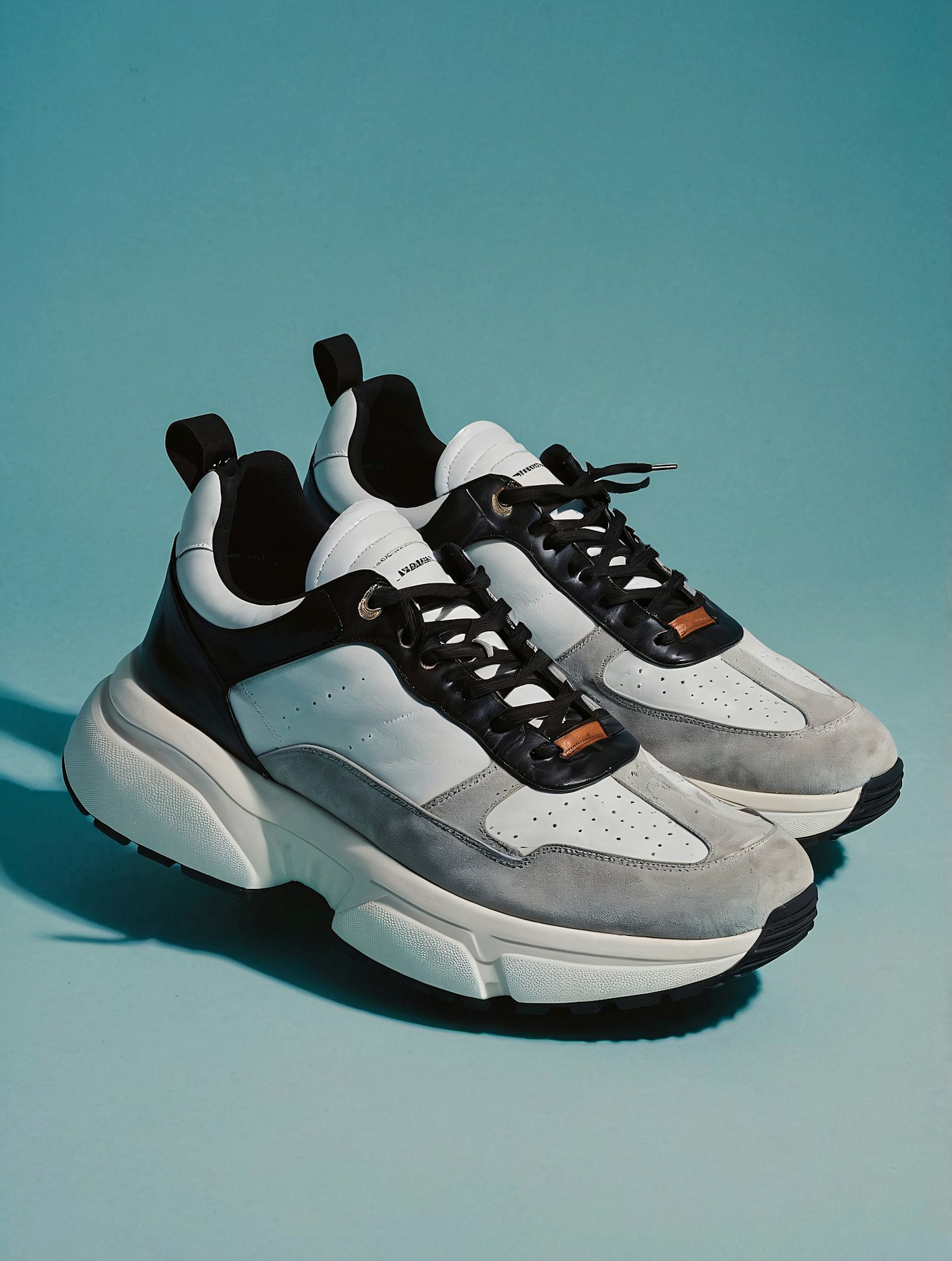 Stylish sneakers with white, gray, and black design on a teal background, featuring chunky soles and modern detailing.