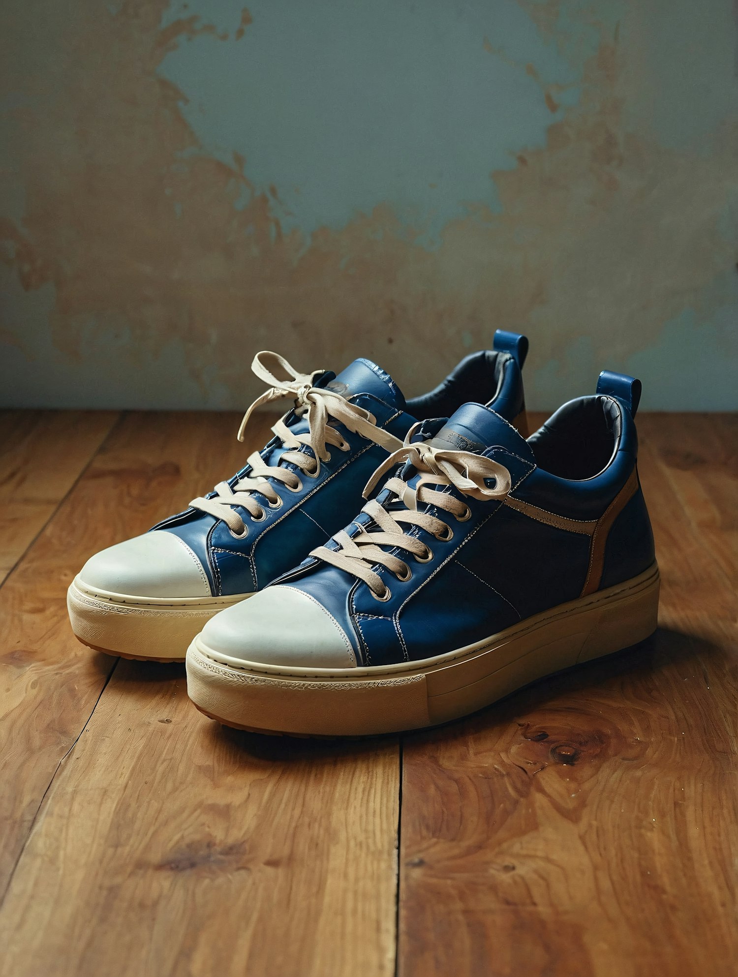 Stylish blue and beige sneakers on a wooden floor, featuring a modern design with leather upper and thick sole.