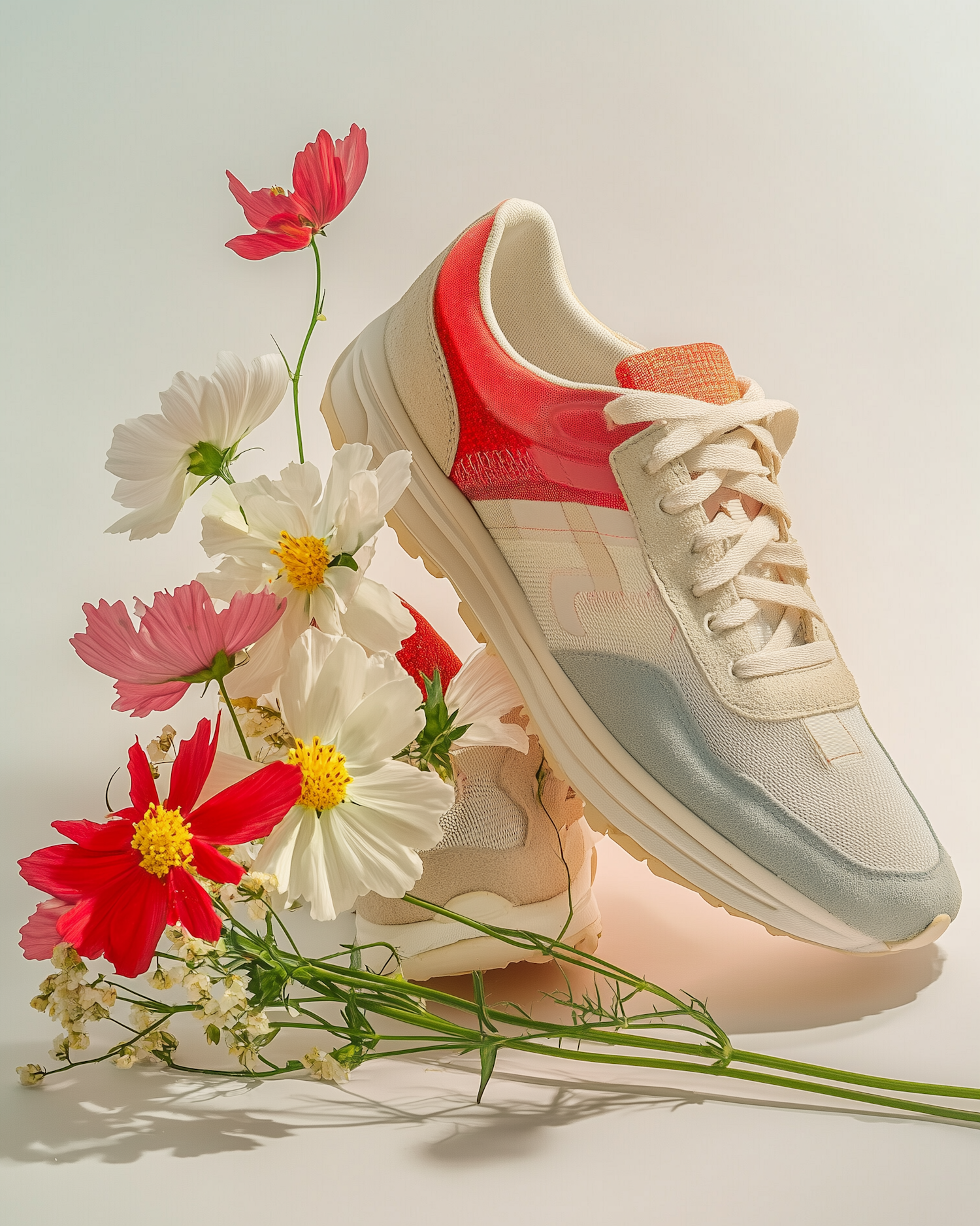 Stylish sneaker with cream, red, and blue hues surrounded by vibrant red, pink, and white flowers on a neutral background.