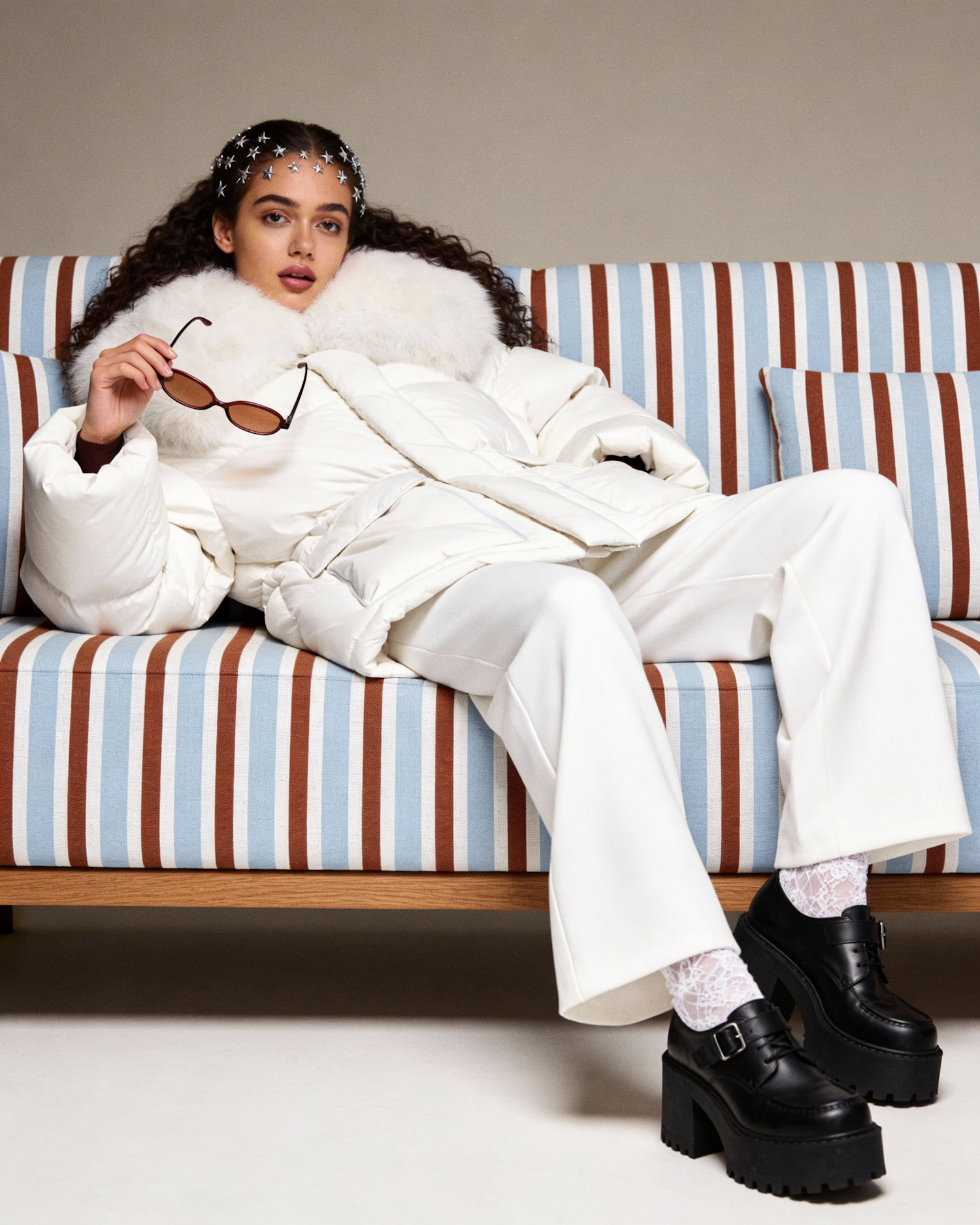 Stylish individual in a white puffer jacket and black platform shoes, seated on a striped sofa with a neutral background.