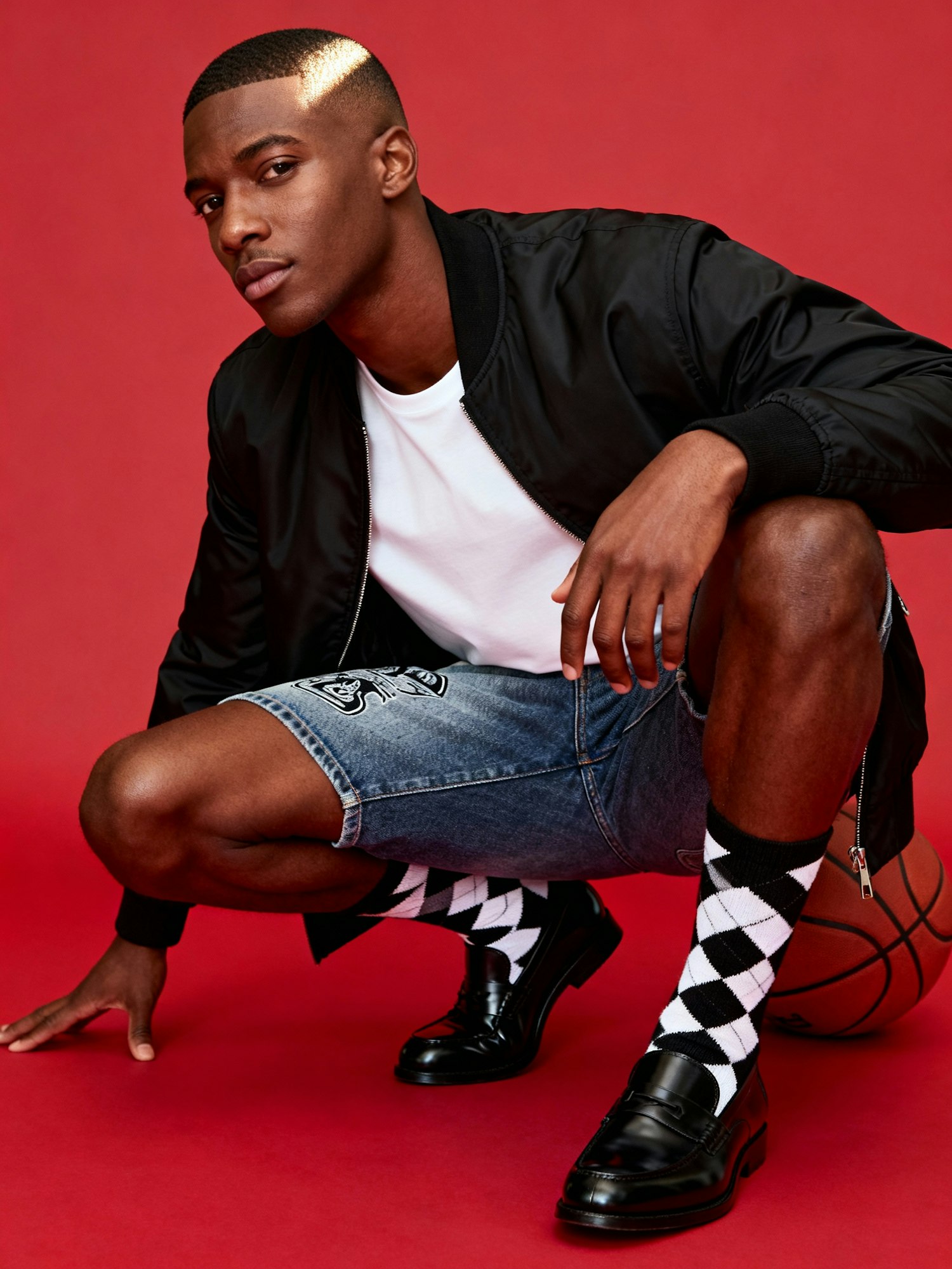 Stylish young man crouching in a bold red setting, wearing a black jacket, denim shorts, and patterned socks with loafers.