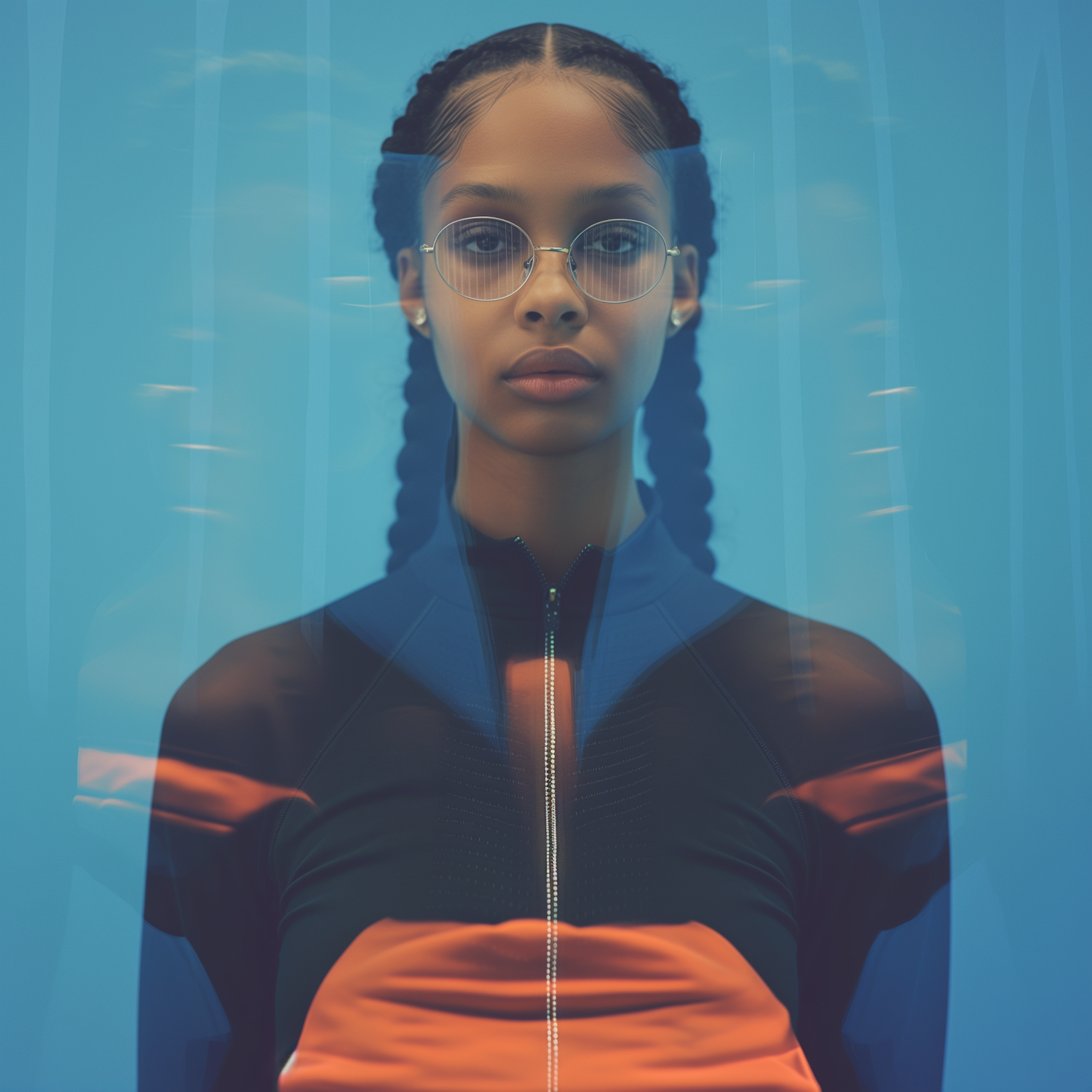 Artistic portrait of a young woman with braids and glasses, set against a vibrant blue background with a double-exposure effect.
