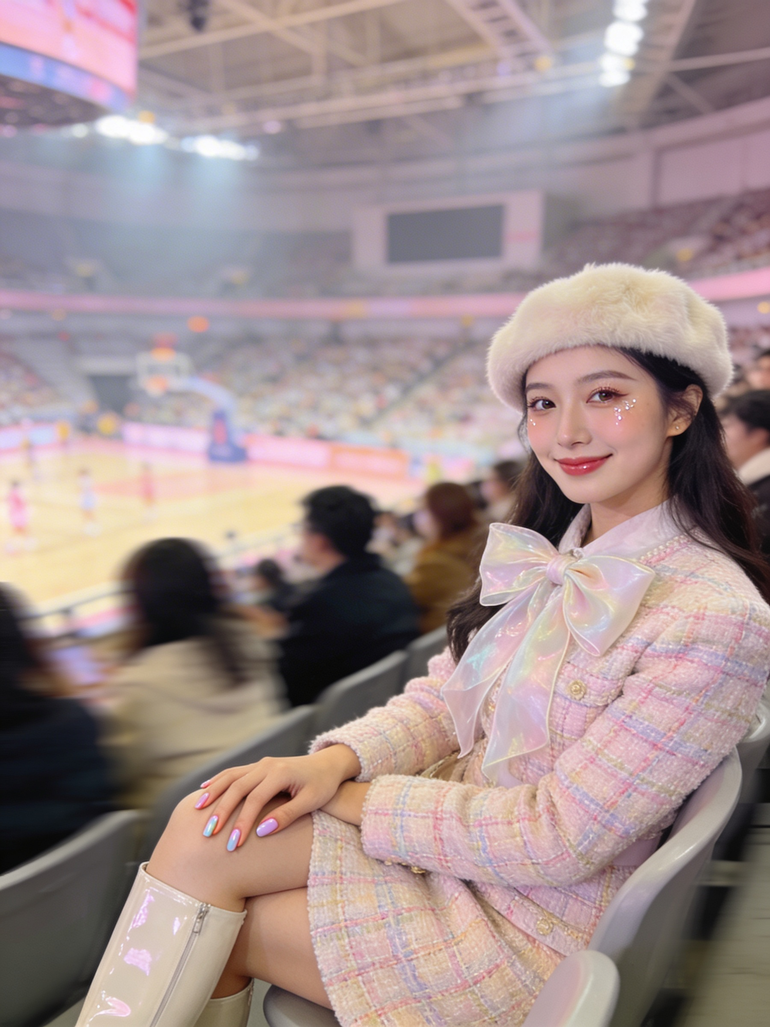 A high‑definition, Pinterest‑viral candid photo inside a bright indoor arena. A stylish person sits in the stands wearing a soft‑girl inspired outfit: pastel tweed dress, fluffy beret, glossy knee‑high boots, and a delicate oversized bow accessory. Their makeup is dewy and natural, nails pastel‑polished. They’re smiling softly while watching the event. The crowd behind them is blurred for a dreamy depth‑of‑field effect. Warm lighting, airy tones, and a gentle editorial glow. No logos, no watermarks.