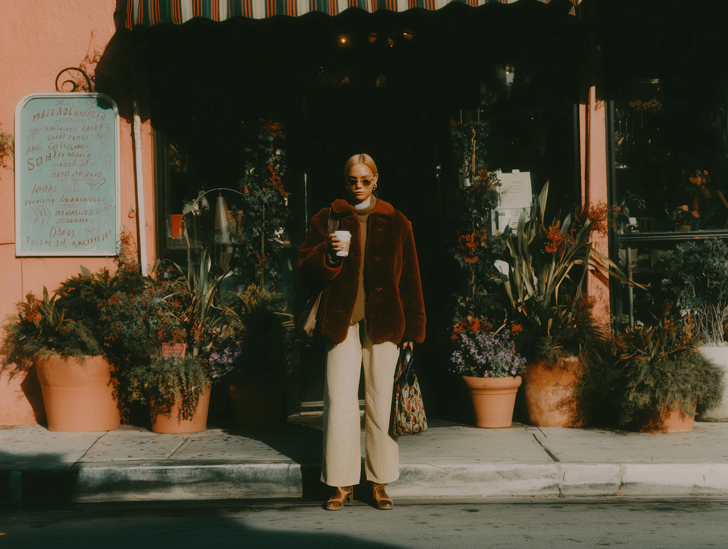 A stylish individual in a brown coat and sunglasses stands outside a plant-decorated storefront, holding a coffee cup and a patterned bag.