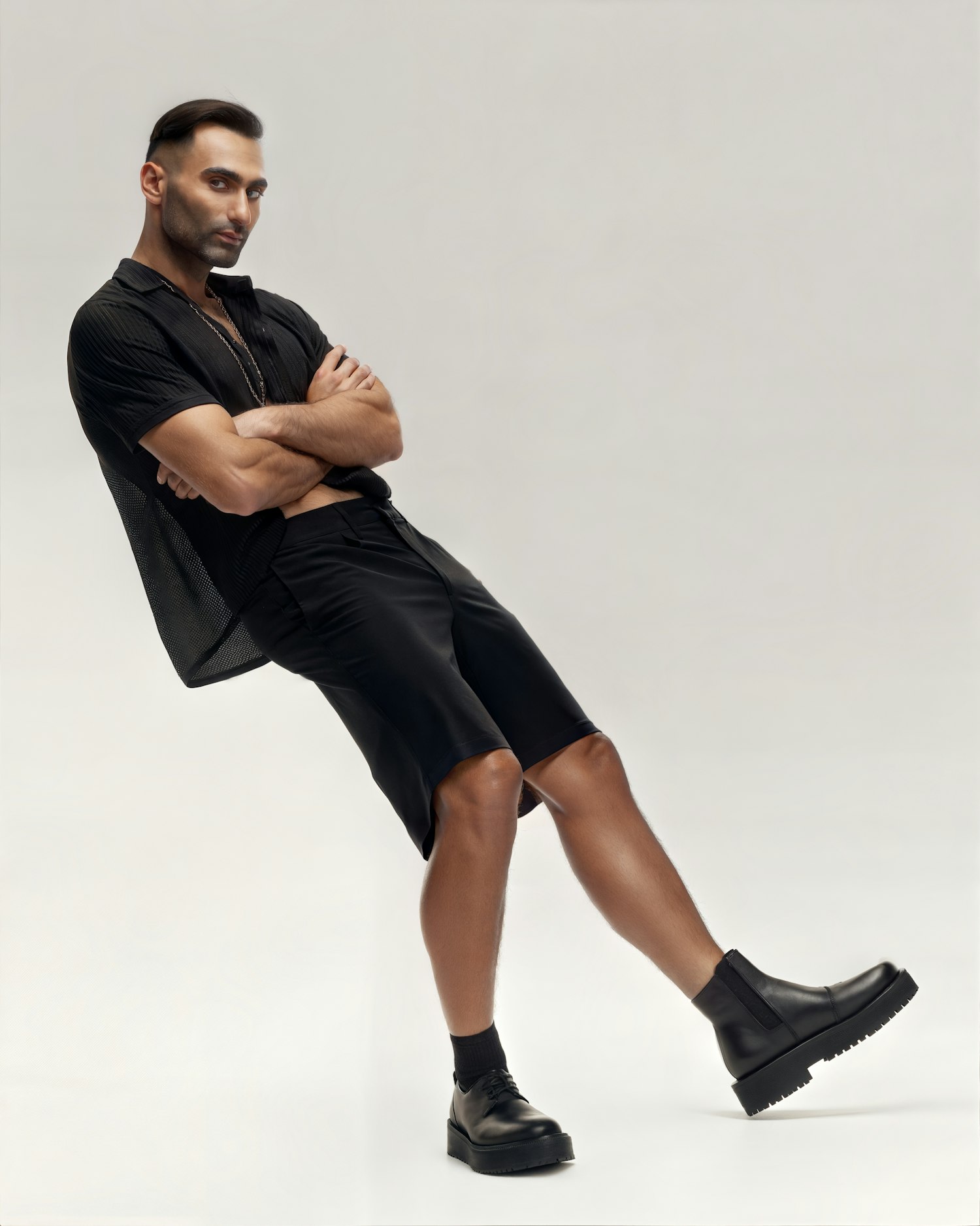 A stylish man in black attire strikes a dynamic pose in a studio setting, showcasing modern fashion with a neutral background.