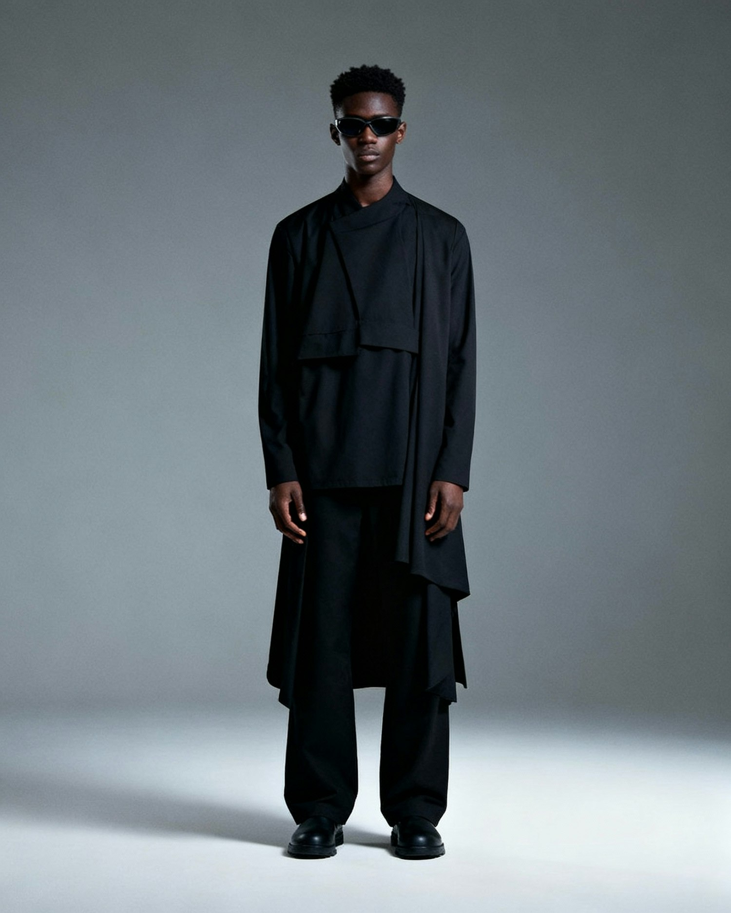 A person in a sleek, all-black outfit with layered details and sunglasses, standing against a neutral gray background.