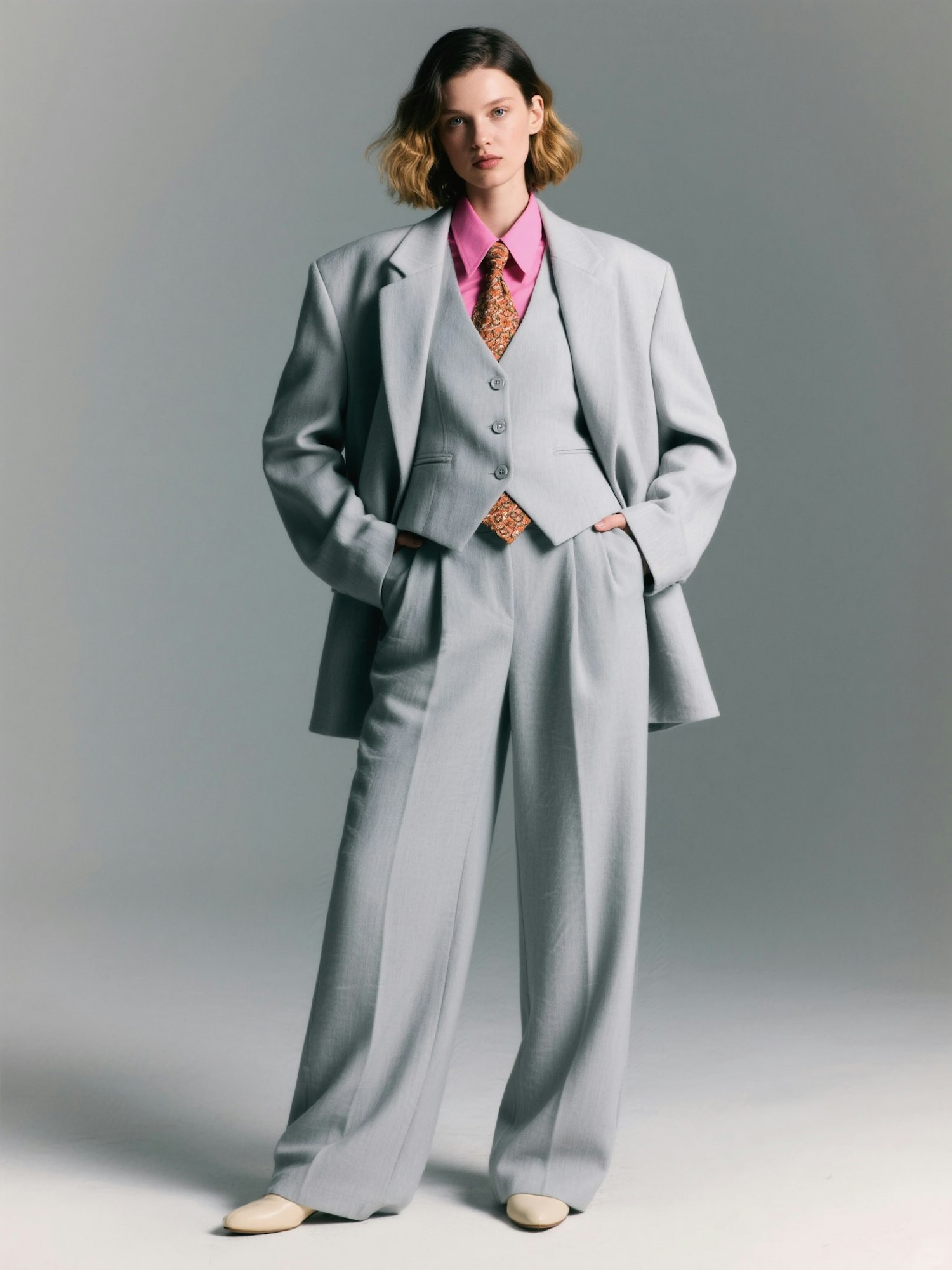 Studio fashion editorial full-body portrait of a woman with a dark blonde bob haircut, slightly wavy, exuding strength and femininity. She is wearing an oversized light gray suit with very wide trousers, a matching buttoned vest, and a large blazer with wide shoulders draped over her frame. Underneath, she has a bright pink shirt with a pointed collar and a patterned tie in warm tones. Her hands are placed casually in her trouser pockets, her posture relaxed yet assertive, looking directly at the camera with confidence. She completes the look with light-colored shoes. The background is a seamless neutral gray studio backdrop, smooth and continuous, without any visible floor separation. Lighting is soft, evenly diffused, with subtle shadows that define the textures of the fabrics and the oversized tailoring. The overall art direction is minimal, modern, and editorial, emphasizing strength, presence, and effortless attitude as part of a cohesive fashion campaign