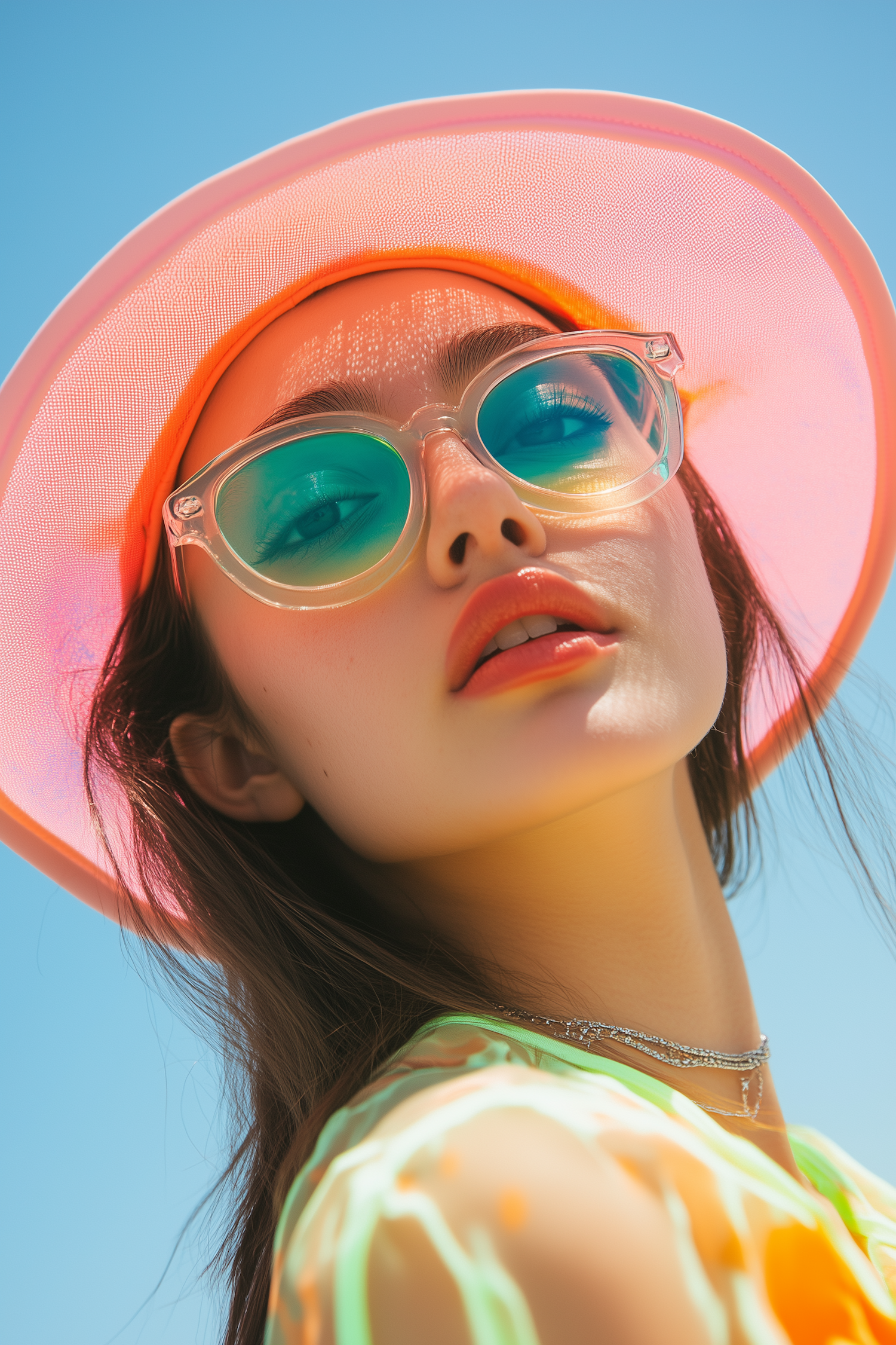 Stylish woman in pink sun hat and teal sunglasses against a bright blue sky, exuding summer vibes with neon tones and bold accessories.